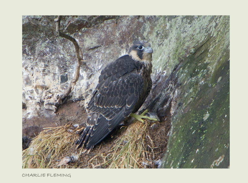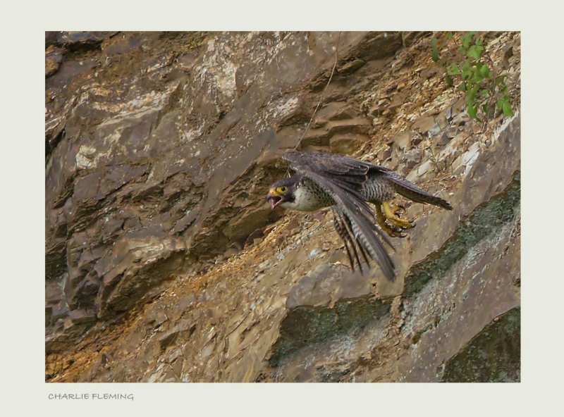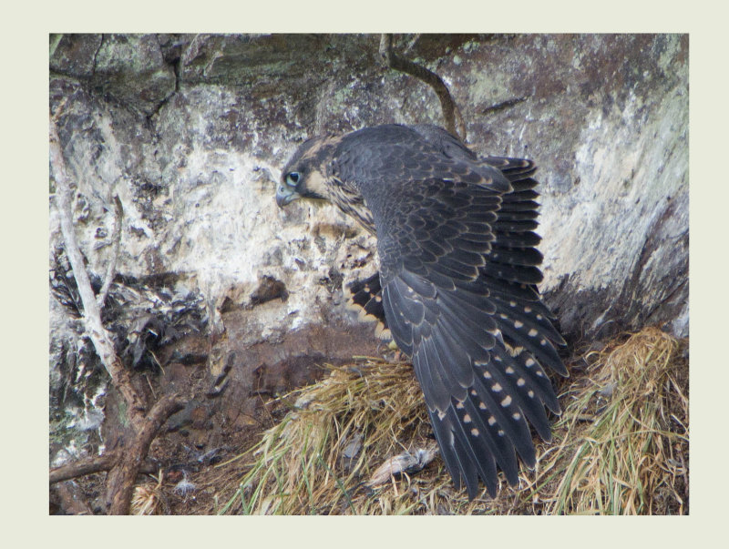 This is the nest of a breeding pair of Peregrine Falcons that have bred at this site for the last few years. When I visited today,for the first time this breeding season, even though I knew roughly where the nest was, it took me quite a while to locate it. It was exciting to see these fully grown, almost ready to fledge youngsters. In the field I could only see 3 but when I looked at the images back at home I could clearly see 4 healthy babies. The birds are breeding well away from any human interference. It is very difficult to climb up to an area opposite the nest ledge where I could get a clear view of the nest from the hide that I built and remains from last year. There is thick cover which enabled me to approach without disturbance. Peregrine falcons are extremely sensitive to the presence of humans and without the thick cover it would be impossible to approach the nest, even from 50 metres, without the adult birds being aware. I stayed at the nest site for a couple of hours, in that time I watched the young birds snoozing, preening and sleeping off the last meal. I was hidden beautifully in a hide which I can carefully approach from under he cover of woodland. From this vantage point I have a clear view of the nest and also the sky above. From time to time both parents would fly around calling occasionally. I was able to get this photo as one of the birds flew over me.