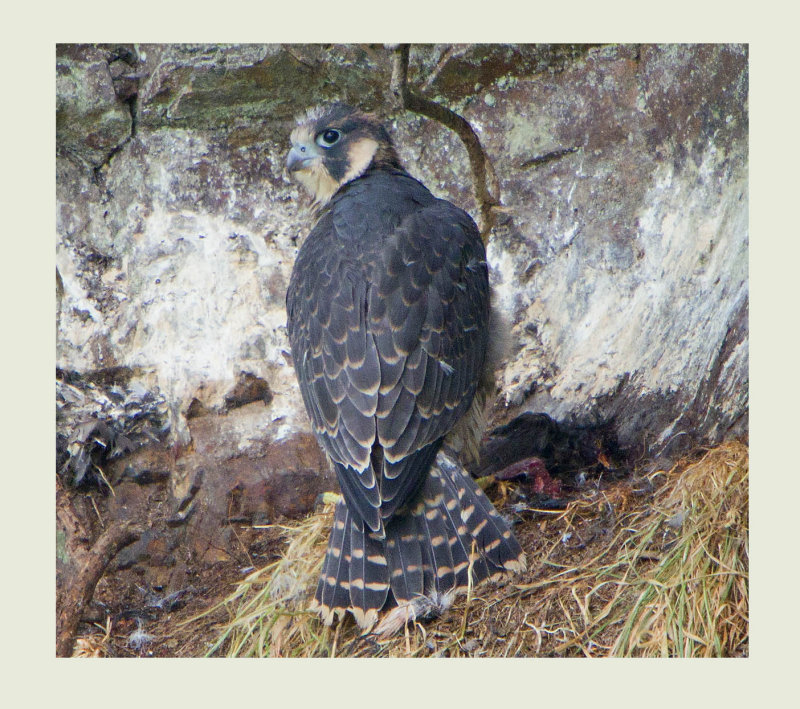 I cant be sure where on the ledge the eggs were actually laid but at the moment, just prior to fledging the nest the birds are quite mobile and move around an area of the ledge which is about 6 feet wide. This grass knoll seems to be a favourite spot. After a few days 3 had fledged leaving just one youngster on it's own. This bird appeared to be several days behind the others in development giving me the impression that it had hatched a day or so later than the others which is contrary to information that I have previously read.