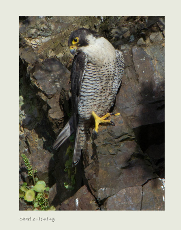 Then she flies away from the nest after feeding it to the youngsters unlike the male who seems to just drop the prey for them to deal with. The female is a noticeably bigger bird than male. This is the first real look I have had of her and I was surprised at the difference in size between the two adults. It was also interesting to see how dark she is. She has a relatively small head. Here she has left the nest ledge with a Blackbird prey and seems to be stashing it in a crevice in the rocks (below) before flying off again. (see above).