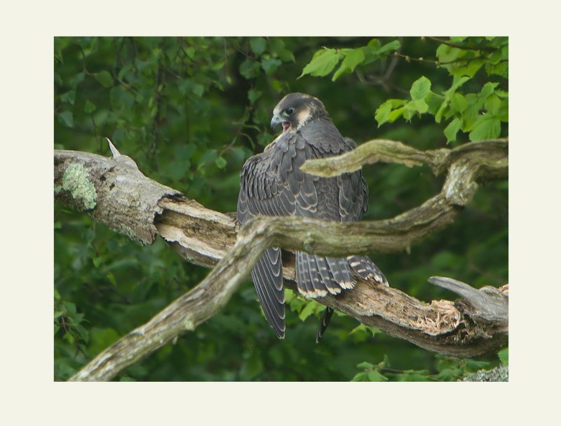 On the 14th June I visited twice. There were still two youngsters still to fledge and then the 2 became 3 when one returned to the ledge. When I returned in the evening and watched the 2 youngsters on the ledge on a dead tree to the left of the ledge the female was keeping guard, noisily calling now and again. In the same tree one of the youngsters sat on a perch beneath her and then the male arrived and began to pluck a recently caught prey item. This took about ten minutes before he flew over to the ledge and delivered it to the two chicks.