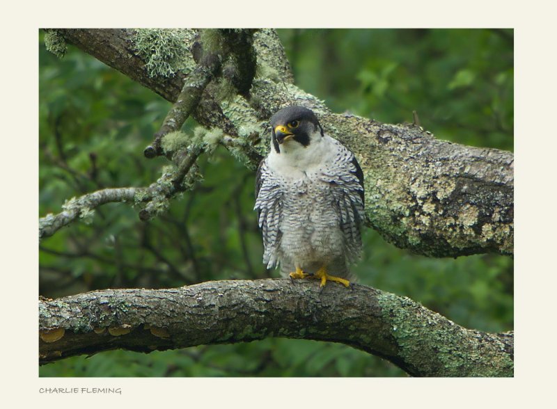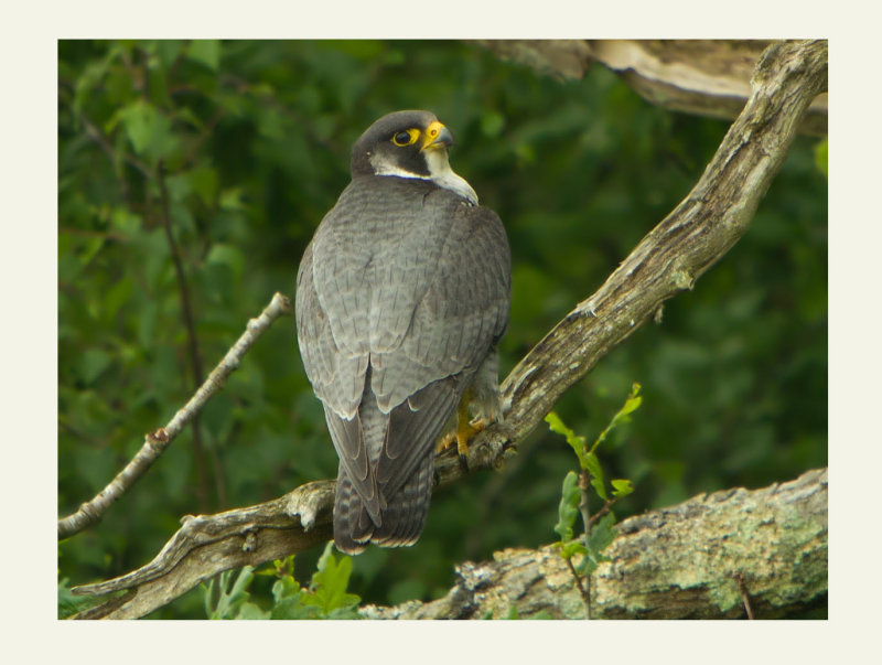 This is the female, she is about to slip quietly off the back of this branch to predate a small songbird. I have been surprised to discover that the majority of prey is small rather than pigeons and ducks etc. This is probably due to the abundance of small birds in the woodland next to the nest site whereas Peregrines that nest on coastal cliffs would predate larger birds such as waders and seabirds.