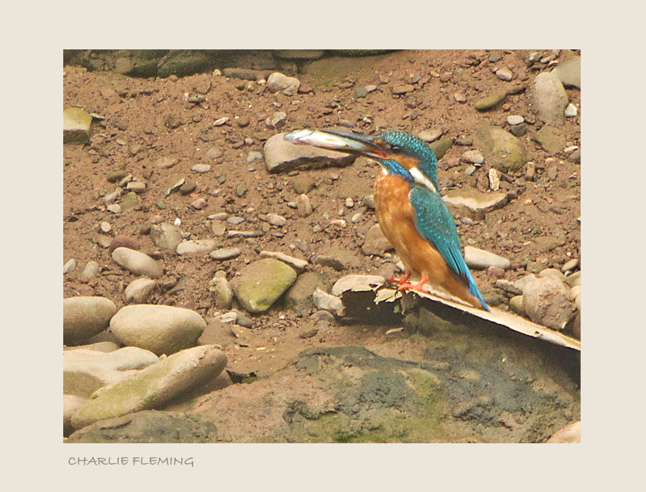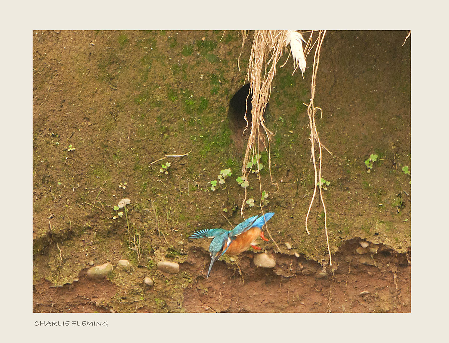 1048. With much double syllable calling ….. Short long short long short long ….a bird arrived with a small perch, a big fish for a baby Kingfisher, come to think of it large for even an adult, this was a first for me. Even though there was a dog in the nearby cow drink he perched on the mud beneath the nest and flew up to feed the young. There was much calling as he flew away, still aware and protesting at the presence of people nearby.