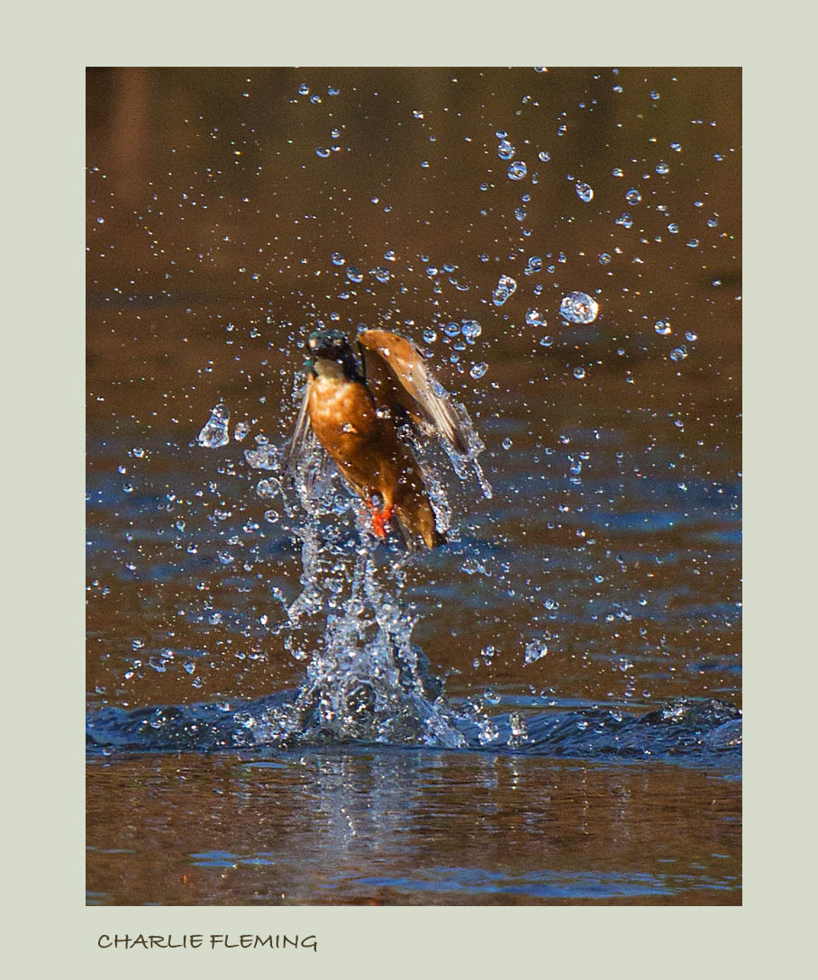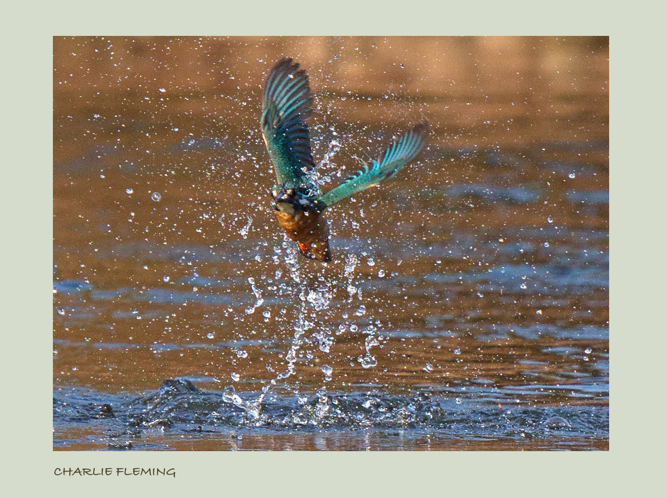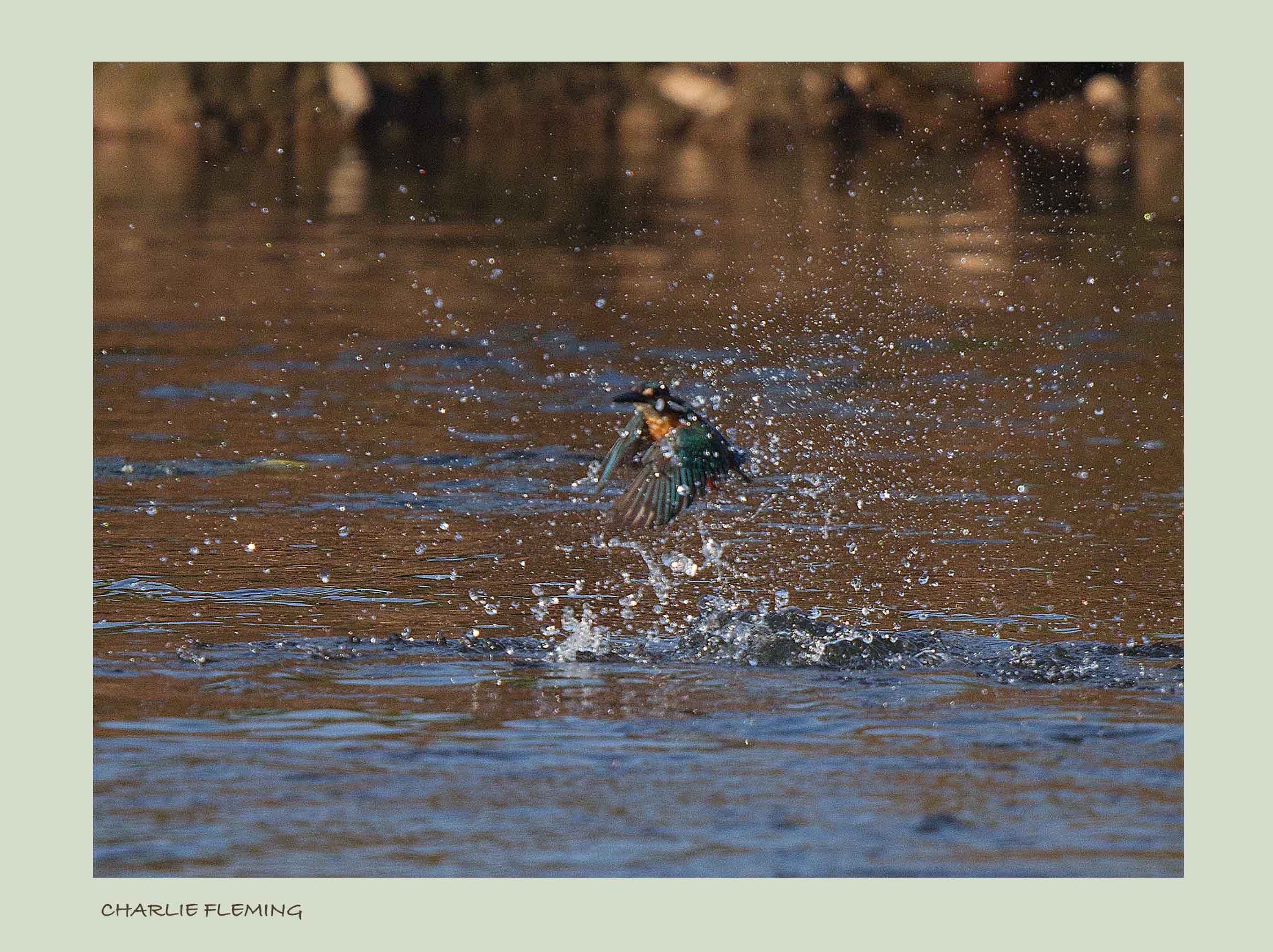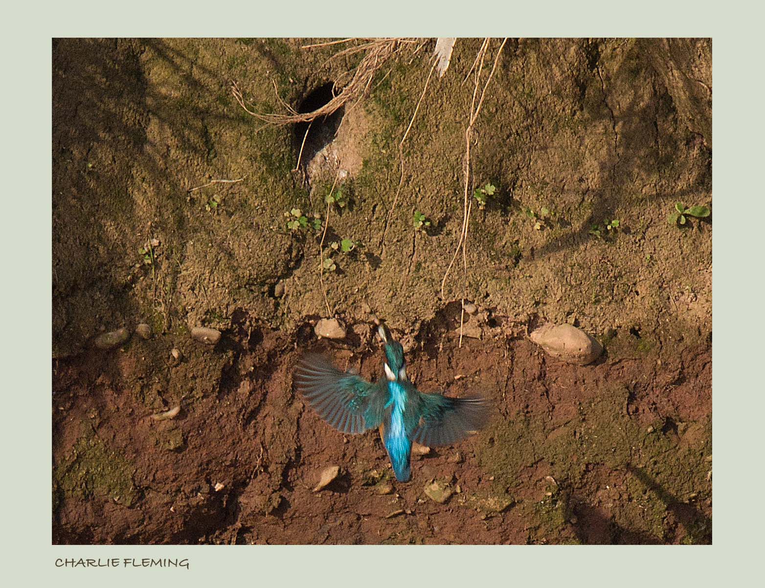 I really enjoyed my 3 hours at the nest site this morning. Its hard to describe how wonderful it is to see a Kingfisher even when you are seeing one for the thousandth time. The sudden appearance of exotic bright blue as it arrives to then disappear a second later in to the burrow is a thrill, time after time. This last few days its been fascinating to watch and then occasionally be able photograph them emerging from the burrow and then splashing in to the water to bathe on the wing. This is a fascinating aspect of their behaviour, it's instinctive of course and I have seen other Kingfishers doing this previously. As they leave the burrow they fly low over the water and then dip in flight a couple of times, without even slowing their speed. I tried to capture this today by trying to predict where this dunking was going to happen. I almost managed it on a couple of occasions.