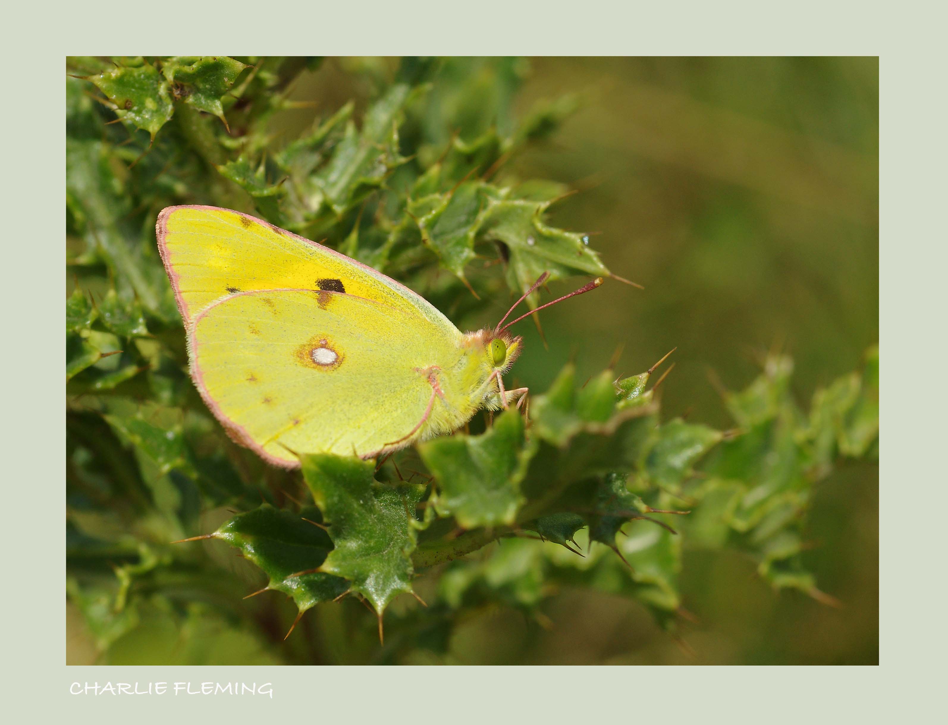 Clouded Yellows are a migrant species, usually being unable to tollerate damp cold winters in the UK. They do breed here though but new individuas arrive from the continent each year to establish fresh breeding stock. It is now thought however that some do survive the winter if conditions remain favourable. I wonder if this particular individual had arived from France, a strong possibilty as it was seen so close to the beach? Imagine that, this insect may have recently flown accross the English Channel, a distance at this point of 103 miles, that is quite a feat of endurance, wind assisted no doubt! However, butterflies do migrate much, much greater distances. For example the Monarch Butterfly of North America flies from Canada to "over-winter" in Mexico, that's more than 2000 miles! This is a butterfly that I have been hoping to see for quite sometime, a good day when I see a species that I haven't seen before.