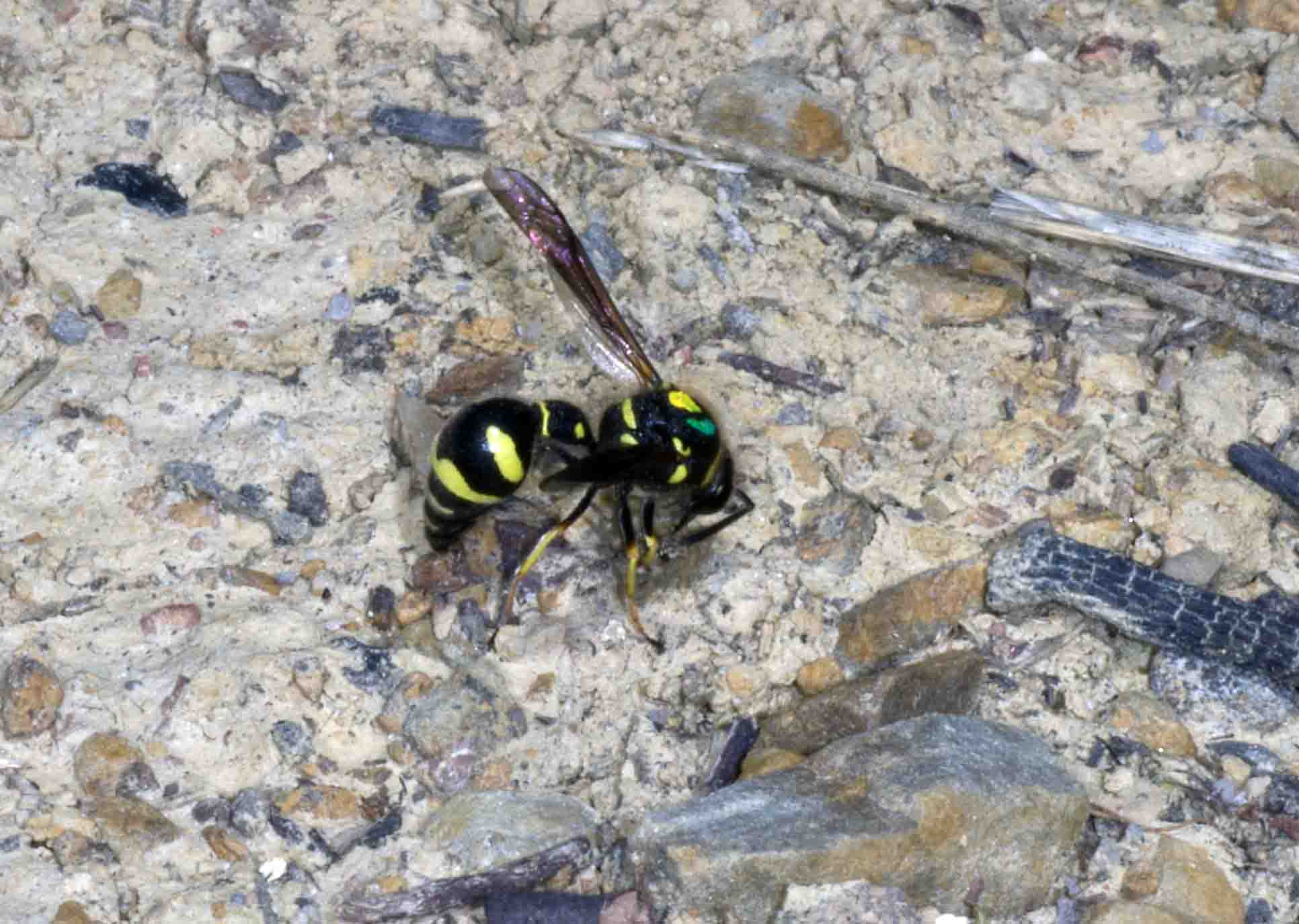 This pot was constructed on the 16th of August and the female wasp took more than a week to fill the pot and then seal it. The pot will contain a single egg and 30 or so tiny anaethatised caterpillars as food for the emerging wasp grub. This little clay capsule will remain sealed until May next year when the adult wasp will break out of the pot and as a newly emerged wasp the life-cycle will begin again. As I explained previously, the pots are constructed from clay collected from small bare patches of earth called "quarries". Previously, I hadn't photographed the clay being collected but on my short visit today, one of John's colour marked wasps was busy constructing a pot nearby and collecting clay.
