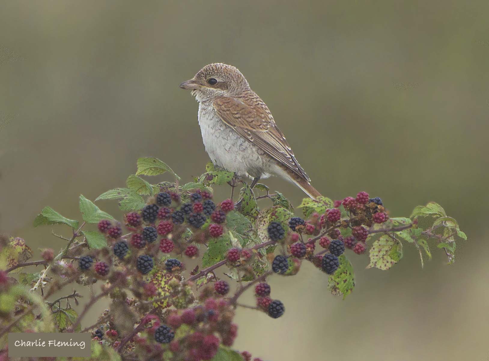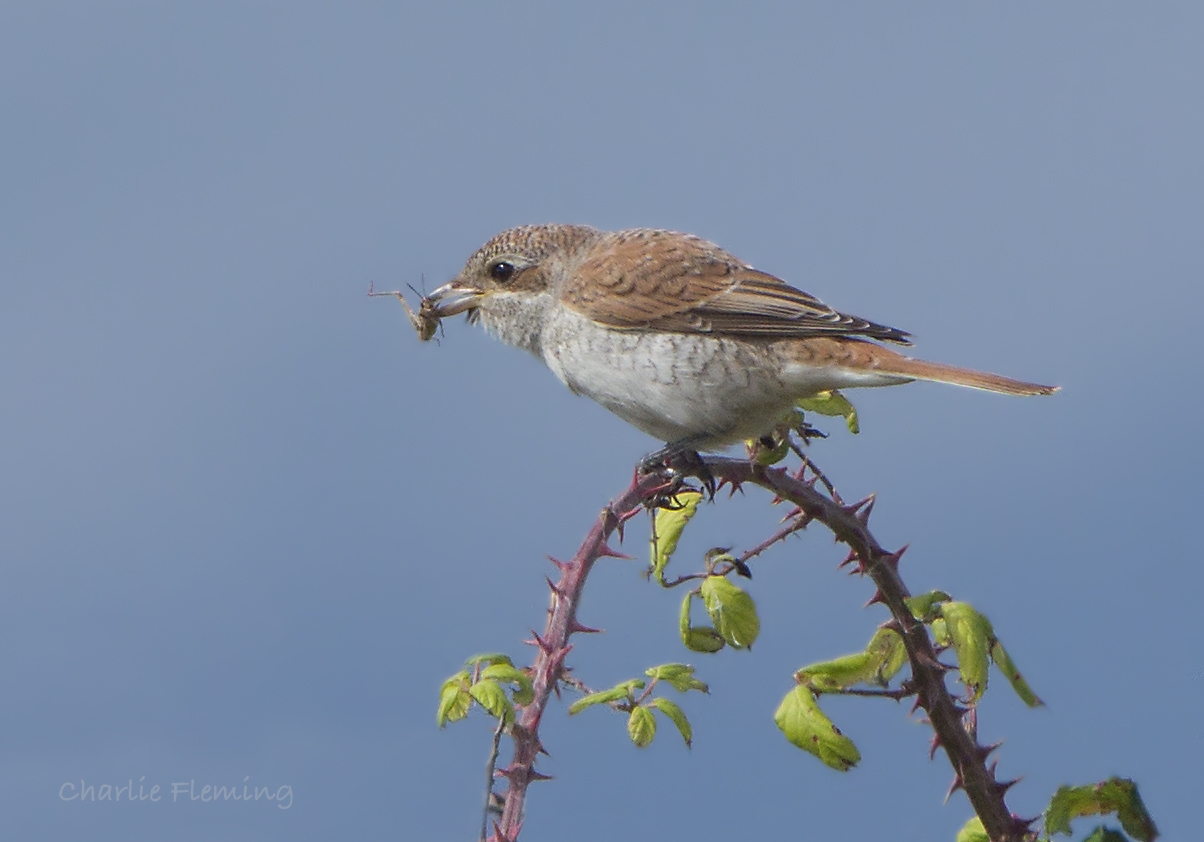I spent a very patient 5 hours this morning waiting for the opportinity to see and hopefully photograph a juvenile Red backed Shrike that was discovered this morning on Dawlish Warren Nature reserve. Seeing it in the distance was one thing but then getting it close enough to photograph was quite a different story. At first it was accross the golf course but in the end it was discovered further down towards the point. Dave Land and I stood for ages trying to get photos of it along with a group of other birders. We were patient as we watched it in the distance…. but now, much nearer, feeding on the brambles in front of us. Eventually Dave and I were left as the birders gave up and drifted home to their cars, probably worried that they hadnt put enough money on their parking tickets. Now without a crowd the bird was much more confiding and it made its way nearer and nearer to us. Eventually it flew to land right in front of me just 10 feet away. I am a lucky person, but the more time you put in to something the luckier you become and my reward was some nice close up pictures.