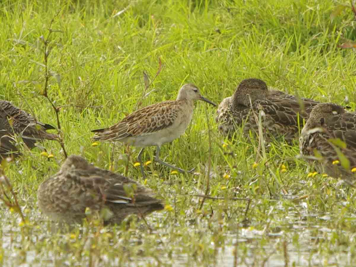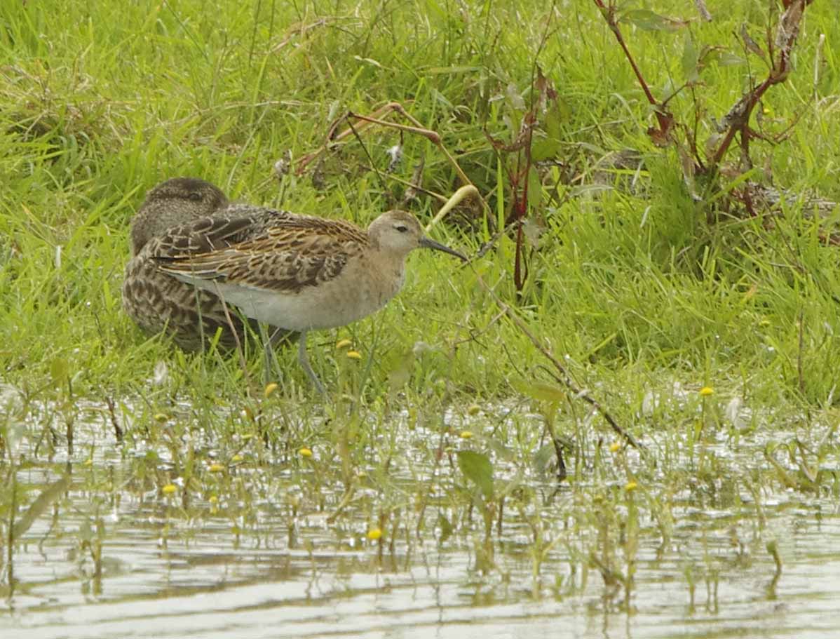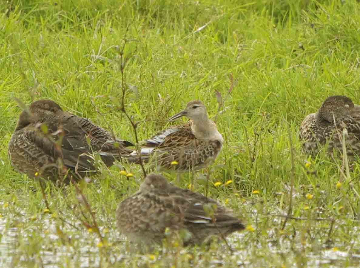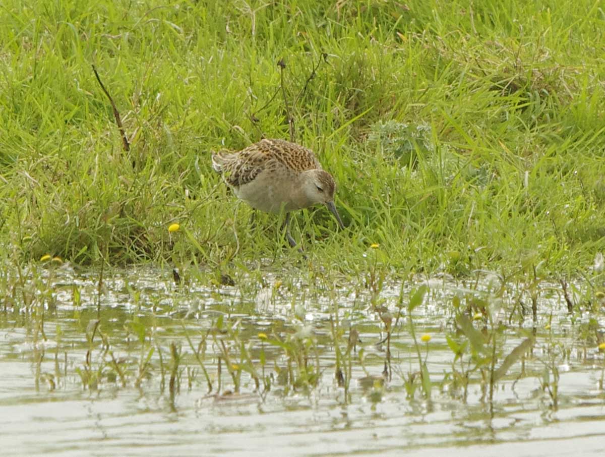 Ruff are variable and normally I would be very pleased to see one, who wouldn't? Yesterday there had been a Pectoral Sandpiper both at Bowling Green and then discovered again later in the afternoon on Exminster Marsh. I went over there in a hurry both yesterday and today, it is a species that I would have liked a photograph for my Devon Birds Gallery. Yesterday it had just departed when I got there, a disappointment of course. I hoped that it would stick around so when I got a phone call today to say that it was back and showing well I rushed back down there full of anticipation. I was pleased when eventually, I started to get some good photos. I wasn't particularly impresed and was beginning to think it was a bit nondescript but there was excitement from the other assembled birders. Then, after a while, other very experienced, adept and adroit birders started to arrive. It wasn't long before doubts were voiced and within a few minutes the sandpiper was correctly identified as a Ruff! The leg colour was the first doubt, they are yellowish in the Pectoral Sandpiper but in this Ruff they were a shade of hardly green, almost grayish in fact. Then it became obvious that the demarcation on the chest was totally absent. In Pectoral Sandpiper there is a clear line between the chest and white belly. So there we had it, a Ruff and I am still to add Pectoral Sandpiper to my galleries. There was much teasing and banter between the assembled group of birders but all agreed that it can be easy to jump to conclusions, the main thing IS to get the ID correct in the end.