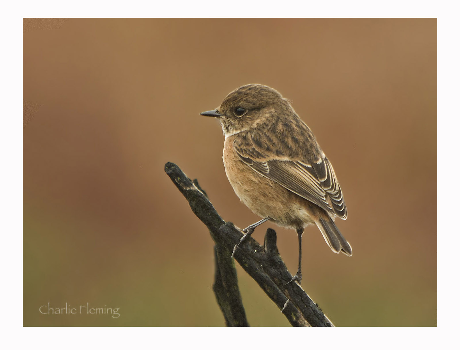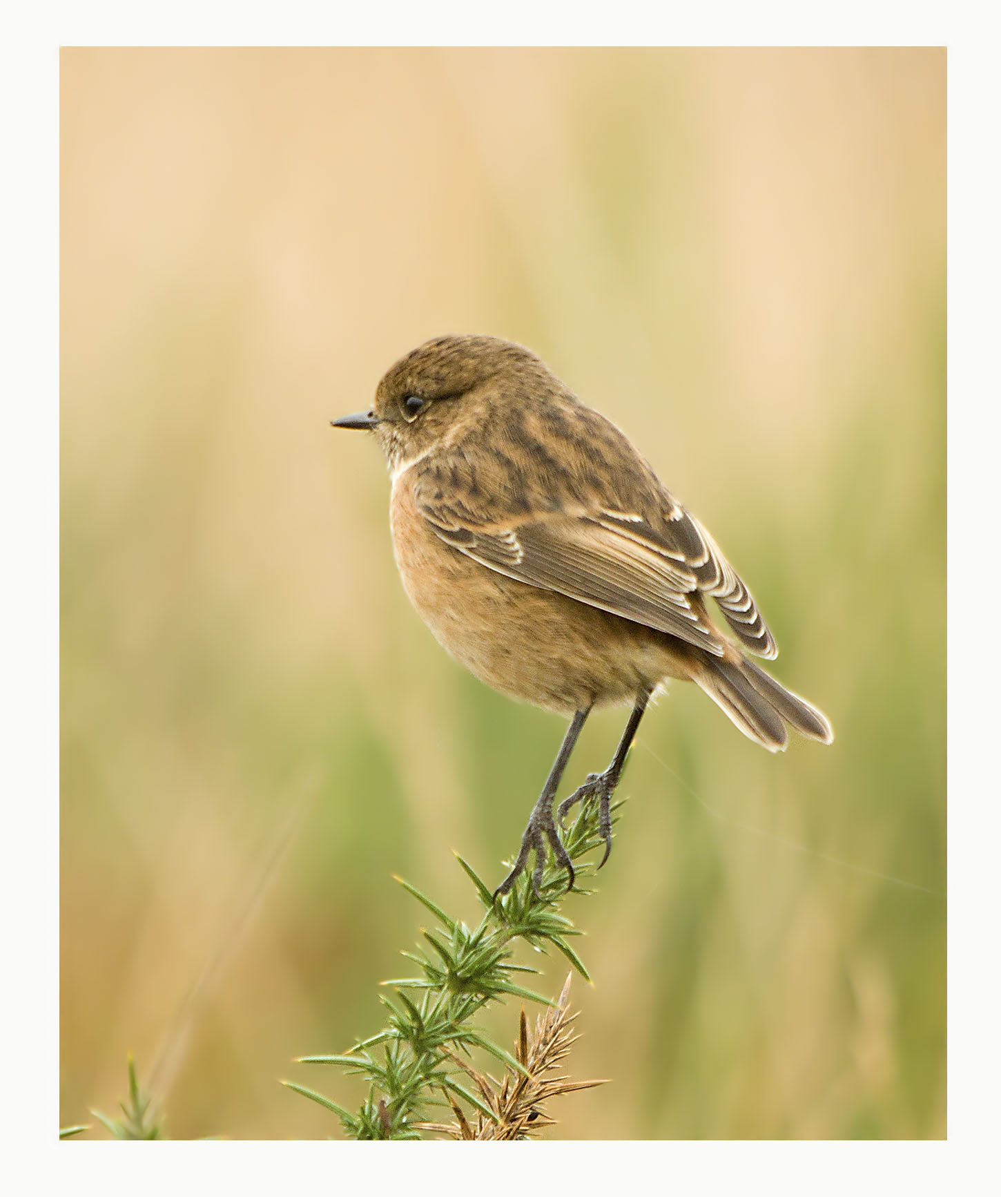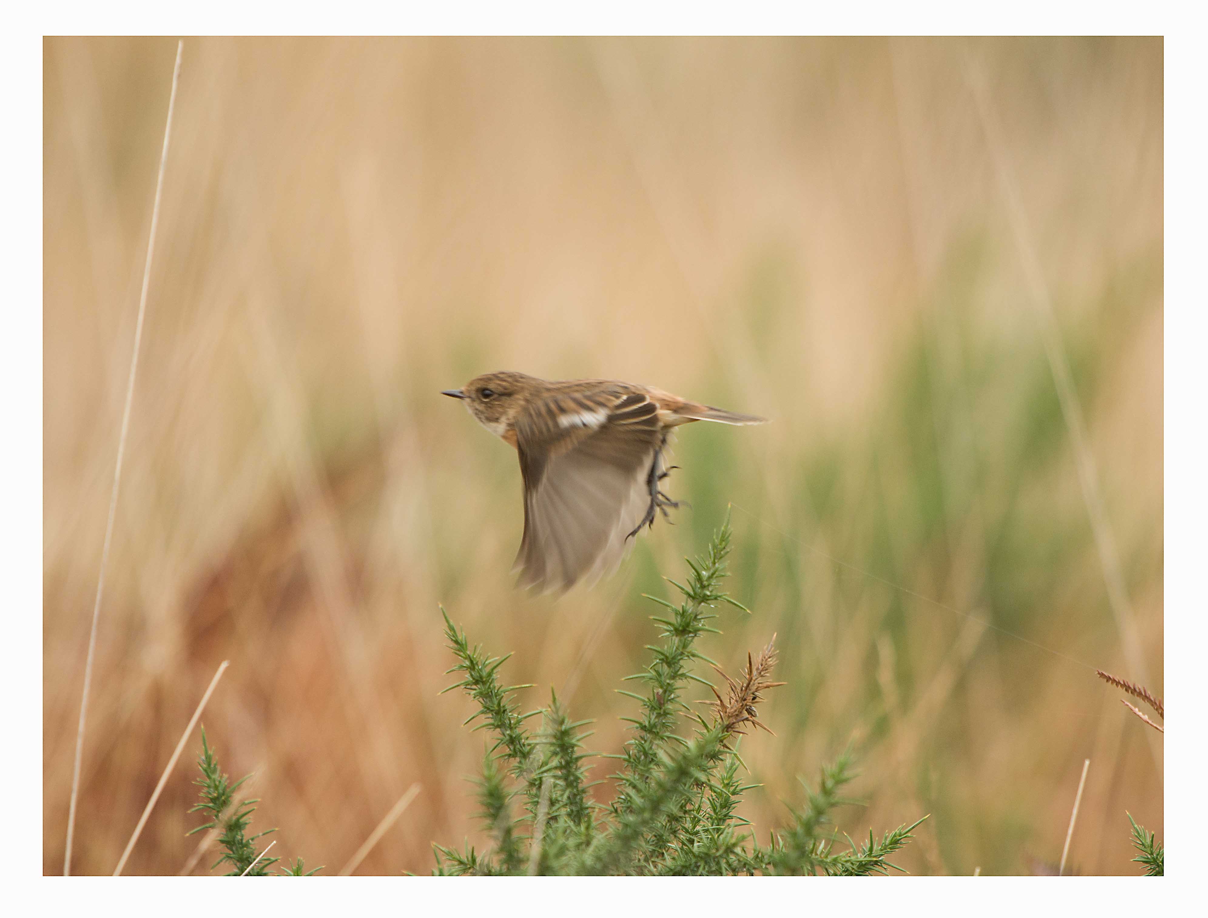 I have lost count of the opportunities that I have had to photograph Stonechat, a nice bird to see here in Devon at all times of the year. In the breeding season they are easy to find on Dartmoor and I have had endless hours of entertainment photographing them. This Autumn I photographed a pair in flight when the male was in attractive full colour but at this time of year the males are in eclipse plumage and while still smart, not quite so distinctive. However, the females looks the same year round. In my experience they seem to stay in pairs all year and if you see one, it's mate will usually be nearby. In the winter they can be found in areas nearer the coast such as the East Devon heaths and marshes, still in their pairs. Here they seem to find enough to eat in the bracken, heather and gorse as well as from time to time launching themselves in to the air to "hawk" for flying insects. They conveniently sit on exposed perches making them easy to spot. I was on Woodbury Common today looking for the Great Grey Shrike that has been seen, on and off since last Monday. All in all I counted 9 or 10 different birders there, all searching for the bird but no one could find it…. and my friend Dave and I were there for 4 hours! However we did see Stonechat pairs almost all afternoon and one bird just kept flying nearer and nearer to us as we stood on the track. It presented a great photo opportunity which we gratefully accepted.