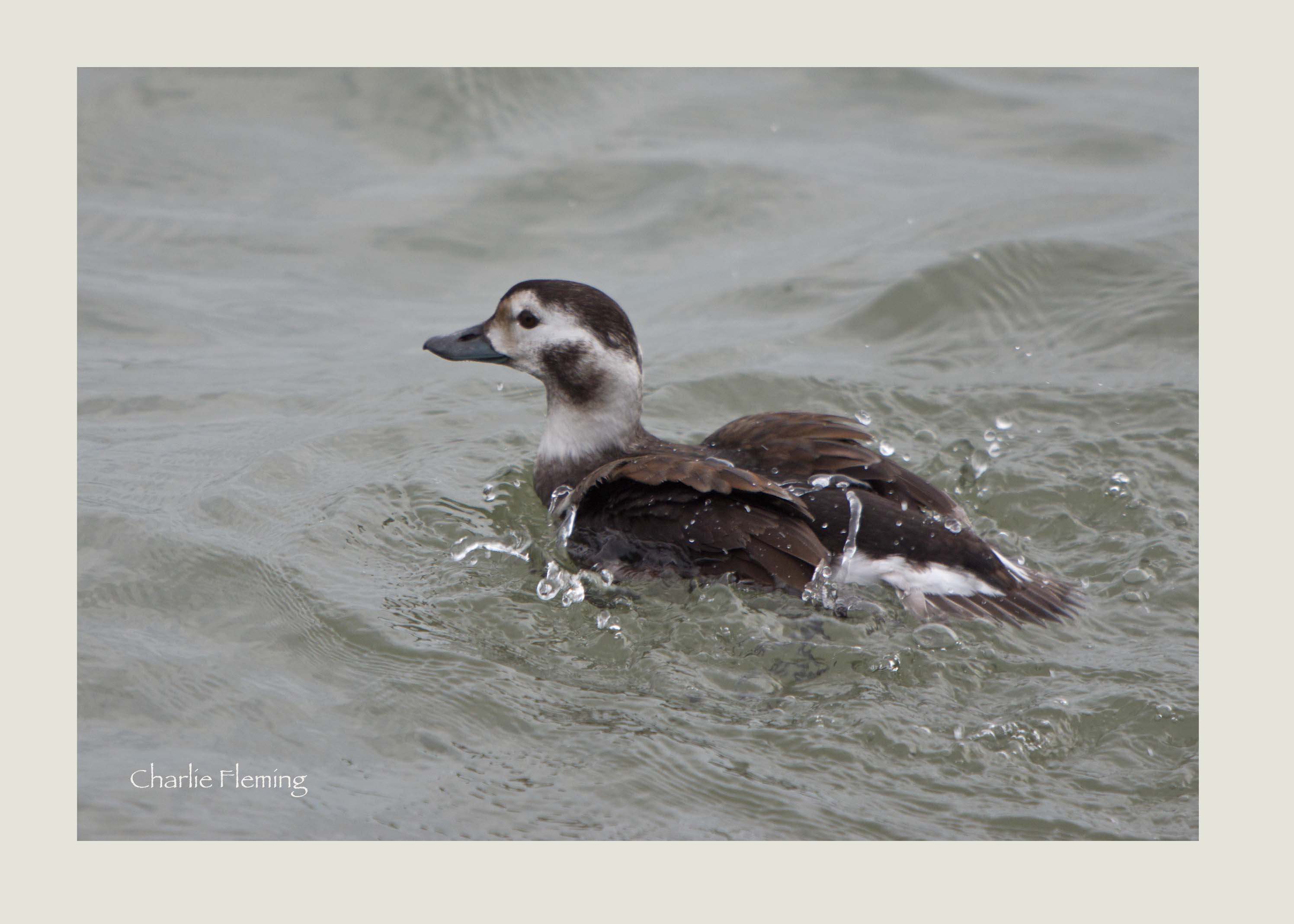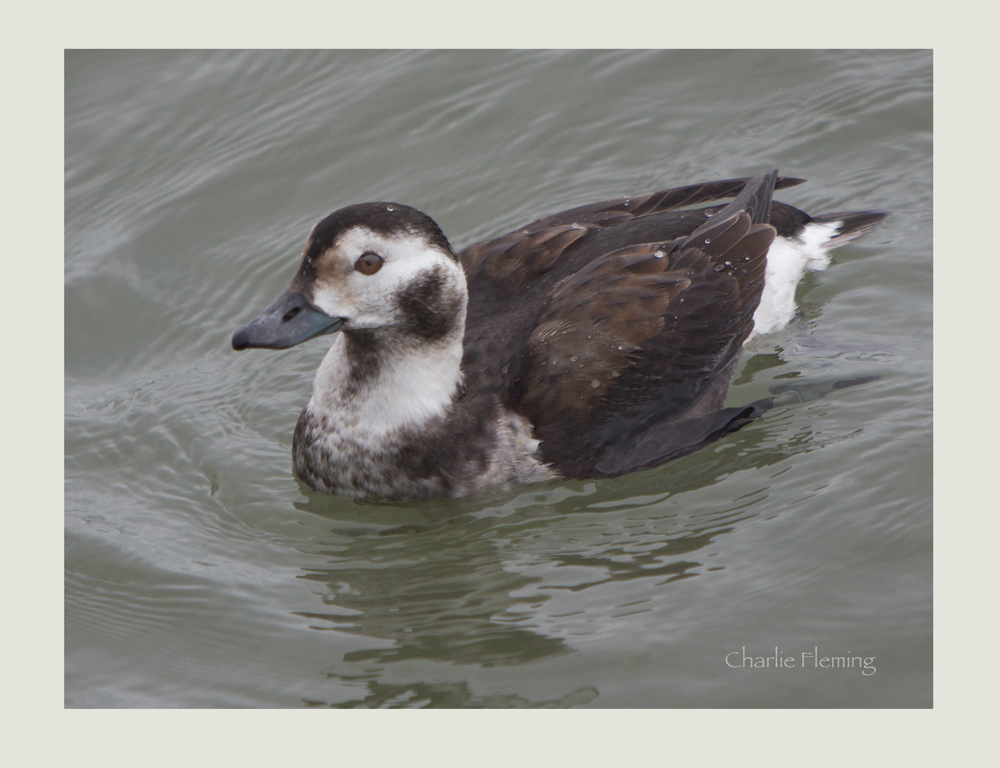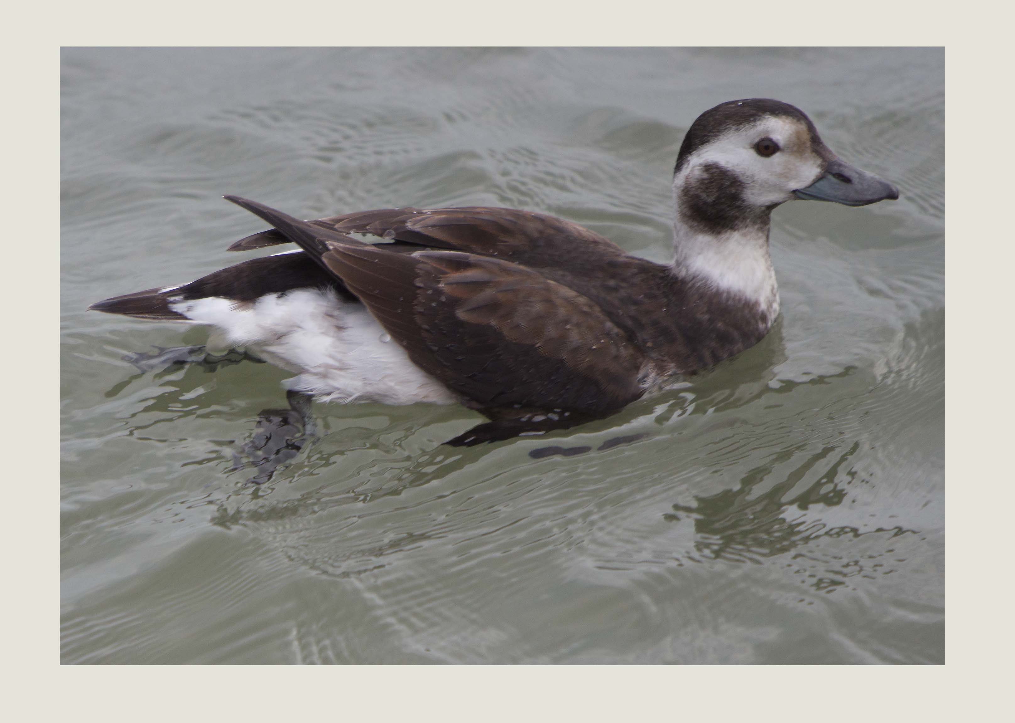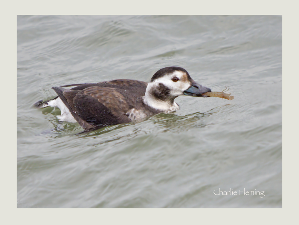 Today's star turn was a female Long – tailed Duck, this time at Dawlish. Like buses, you wait for one and then two come along together. When I got up it was very bright and sunny with a heavy frost but the forecast was for an overcast day. You could see a very low blanket of cloud hanging over the distant East Devon Moors (I can see them from my house by the way). I thought I should get on my way quickly to make use of the available light. I decided to go to Dawlish for the female Long – tailed Duck because I had read that it was feeding quite close to shore. By the time I had parked my car and started to walk along the seafront the cloud had caught up and then after a few minutes we were blanketed in cloud. The duck was visible and I started, almost immediately, to photograph it. It was feeding constantly, diving and staying under the water for a minute or so at a time. It was quite hard to predict where it would emerge on the surface but each time it did , it was a race to photograph it before it dived again. On one occasion it appeared with a large prawn in its beak and it it was a great photo opportunity. When I looked through my photos later I could see that it was quite successful and had caught quite a few largish prawns. Have a look at my blog entry for photos of the Male Long – tailed Duck that I saw and photographed last Wednesday on the 20th on the main pool at Bowling Green Marsh. It will be good to compare the two birds.