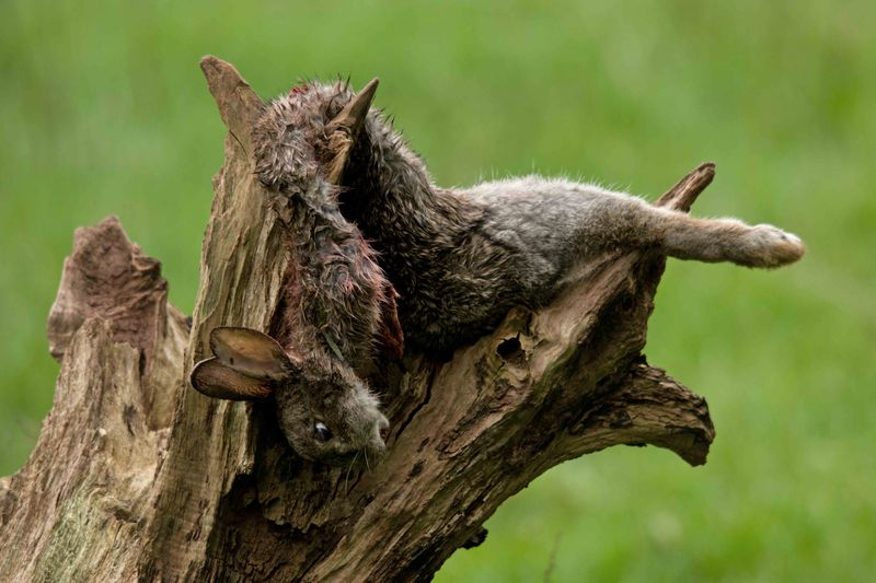 I had placed a dead rabbit out in front of the hide yesterday. Last year this had attracted Buzzards who had come in to feed on the carcass, this is what I hoped for this year. It had taken several weeks for this to be successful last year so I wasn't expecting immediate success. However, I went back to check it out this morning and well….. I couldn't believe it. As I got out of my car a Buzzard flew off from the area of the hide, this bird would not have been disturbed by me, it was just coincidence. I was thrilled to see this but didn't realise what would happen next. I walked up the edge of the field towards the hide which is just tucked away behind the gate and immediately as soon as I got close enough to see the hide, a Buzzard flew up off the rabbit, then as I kept walking, yet another Buzzard, in the trees just above….. 3 Buzzards around and on the kill. I investigated the rabbit which had been well and truly consumed leaving just the rear legs and head. The front legs, innards and all the meat from the rib-cage and backbone had gone! I got myself in position in the caravan but…… I had forgotten to put the memory cards in the camera. …… what an idiot. Back to the car and then home for the cards. When I got back 15 minutes later, there was a Buzzard on it again. I went in to the caravan and waited but there had been too much disturbance now and the Buzzards were a bit too warry and probably well fed as well. I will be back in the morning for another chance to get some movie and photographs and I will be very surprised if I am not successful, very surprised.
