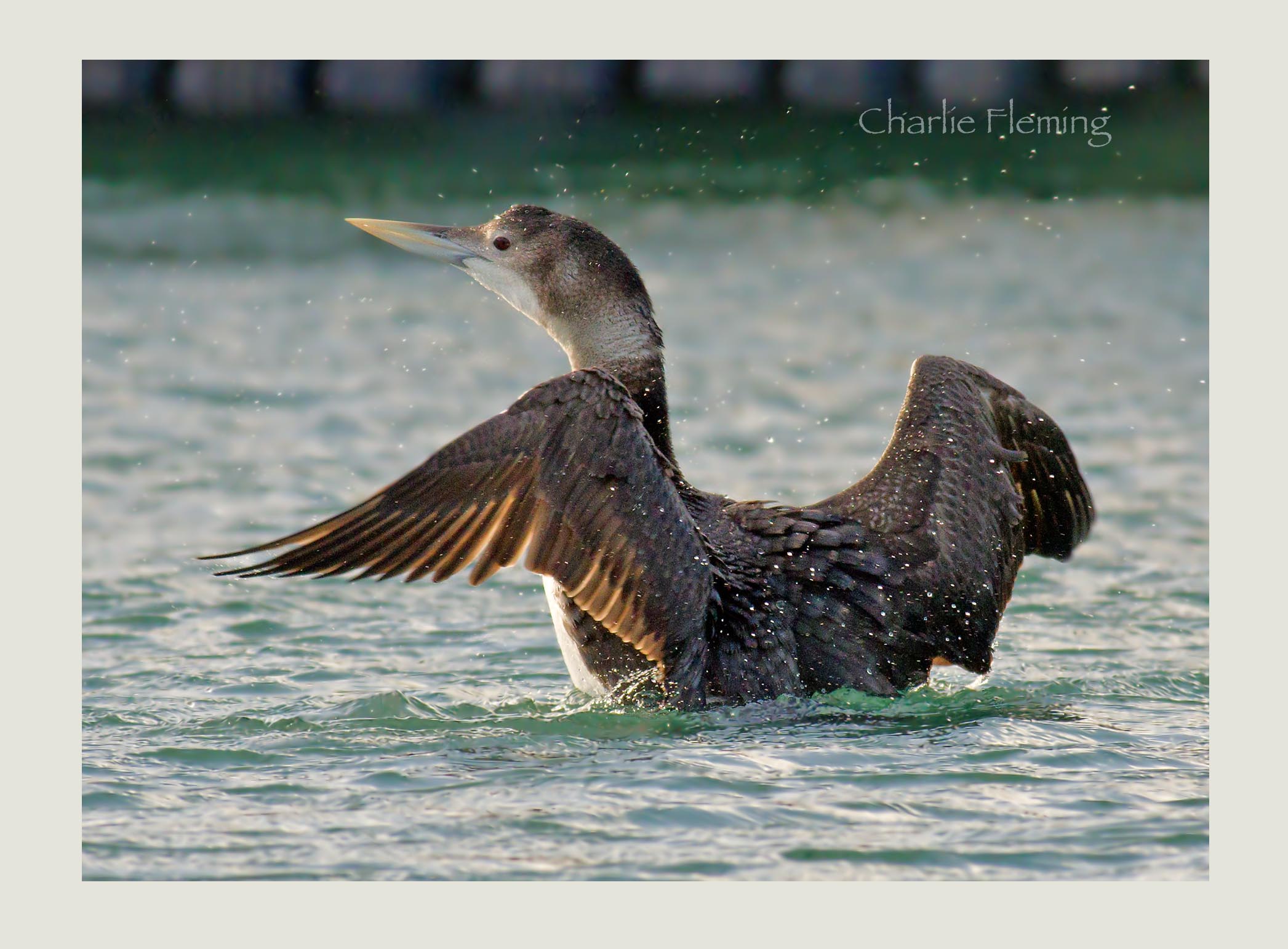 To continue the story of yesterday's encounter with the "Beast of Brixham". We drifted around in the boat, spotting Divers every few minutes or so and it was only a few minutes before we were close to the celebrity. The weather was windy but in the harbour where it was sheltered, it wasn't too bad at all. Andy, the skipper did a brilliant job trying to put us in the right place with the sun behind us but the "beast" wasn't interested in co-operation, constantly diving to feed and then coming up in the wrong place. At one point it splashed around, bathing and preening with a big wing flap. This was a great photo opportunity. (See below). We followed it in to the inner harbour where the shore-based Birders were excitedly running along the harbour-sde to get as near as they could. We held our position and I swapped seats in the boat with Dave who hadn't managed a special shot yet. I was now in the stern of the boat…. suddenly there was the beast, just off the stern, it had popped up with a massive amount of commotion. Great photo opportunities of course. I felt sorry for Dave, now the bird was at the stern whereas before the brow had been the best place to be but I needn't have worried because Dave finished up with brilliant photos as well. It dived down again and we followed it (at a respectable distance of course), out of the harbour and in to the main fairway where it seemed to have a favourite spot. Other Divers were in this spot and we saw the beast surface with a large flatfish which it swallowed quickly before I managed a good shot. Other divers were successfuly surfacing with crabs, obviously a good source of food. The afternoon continued successfuly and we went further out towards the Breakwater to look for the Black Guillemot that I had seen from the Dart Princess on Sunday's cruise. We easily found, it after a bit of searching, if it hadn't have been for the brilliant encounters with the "beast" then this would have been a special encounter…. more about that in my next post with photographs.