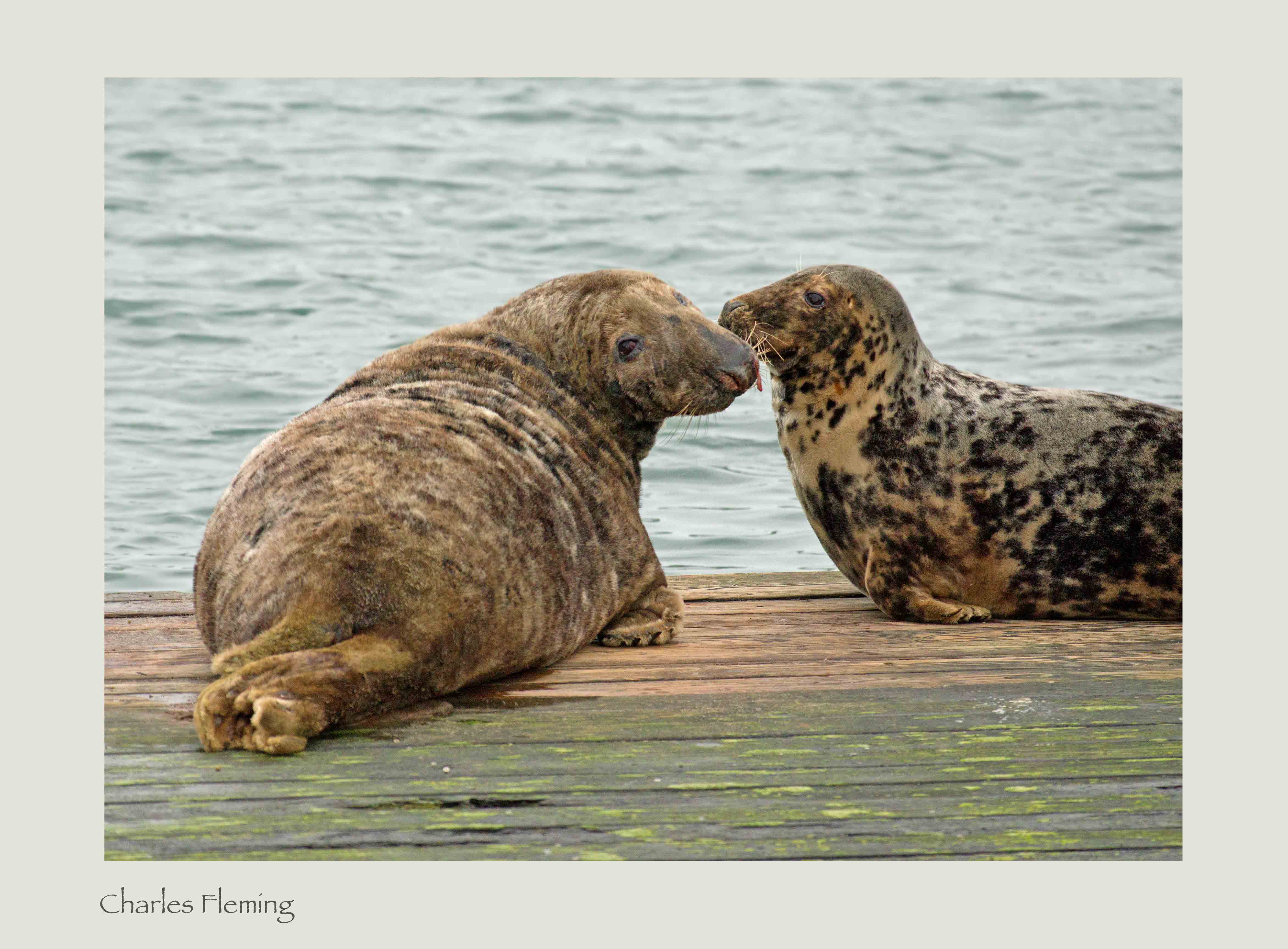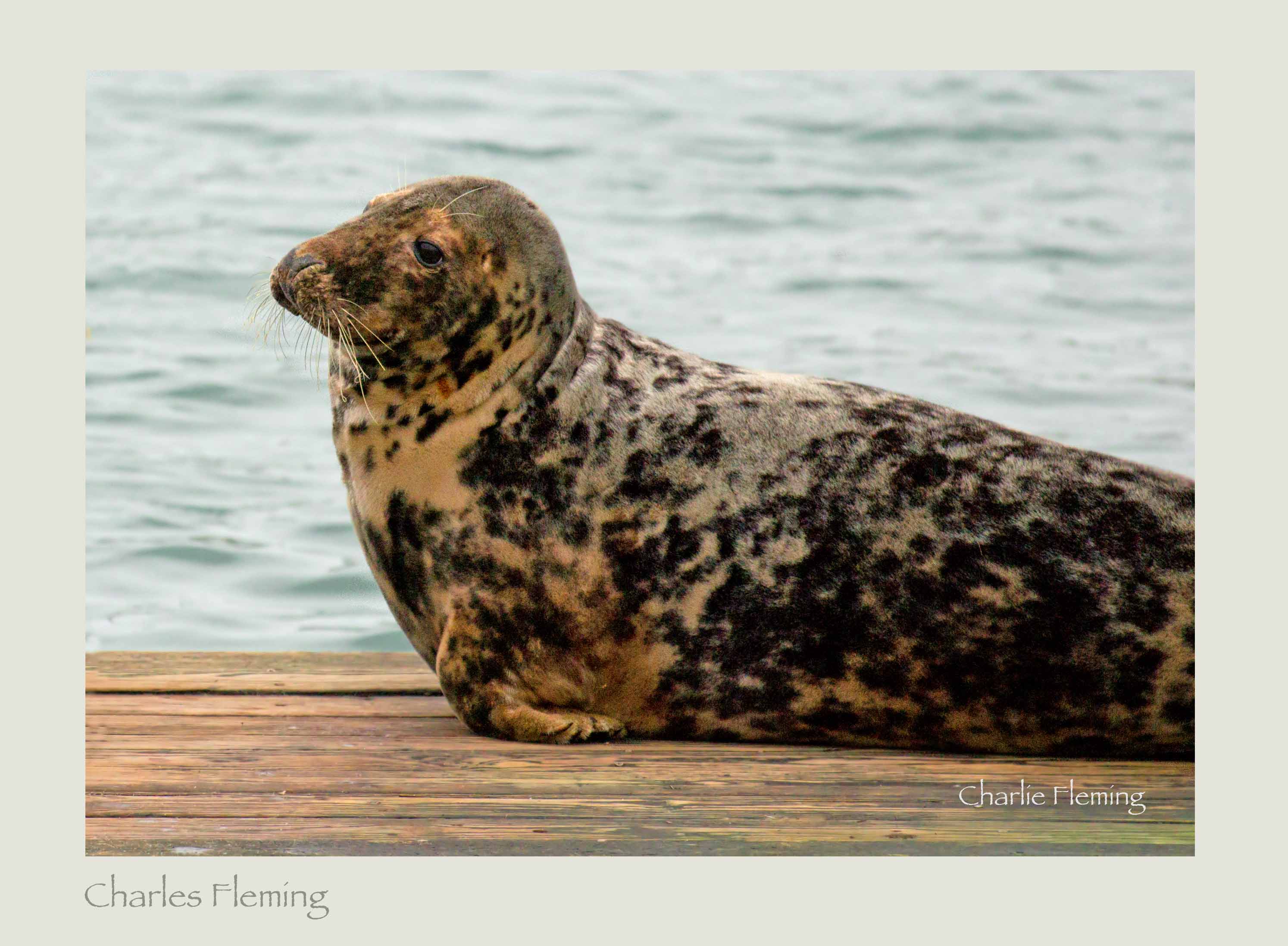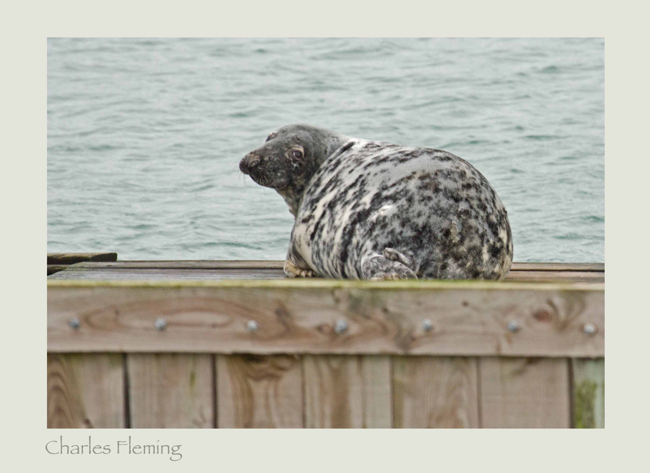 The Grey Seals seen on the trip today were very impressive, they were hauled out on the floating pontoons, 5 in all (later on we saw 2 more), a good total of course. Amongst the seals was a pretty white spotted one, I hadn't realised that they are so variable in coloration but I discovered that the light ones are the females. They are also very distinctib=ve and they can be identified by their patterns. As I photographed the seals I could clearly hear the "blowing" Dolphin close by, a massive distraction to say the least. I hope you are as impressed with these seals as I am. These are big animals and is testimony to the the environment here, It's so reassuring to know that we have all this wildlife in Devon.