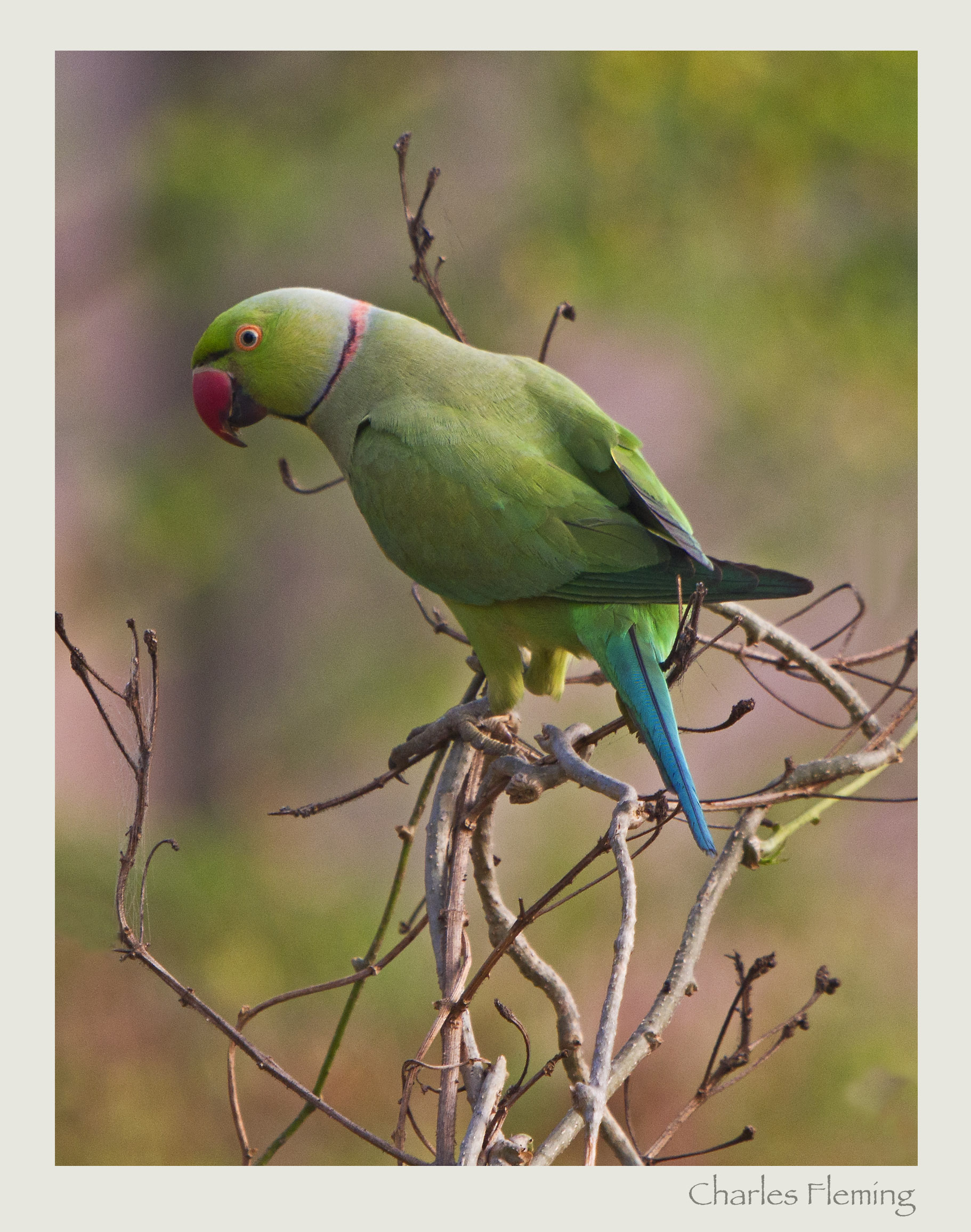 The Oriental Magpie Robin, what a name, very common here and a beautiful singer. As we walked down the road early this morning this bird was on the floor, a great photo opportunity. Before we left I photographed the Parakeet here, this is a Rose Ringed Parakeet and the same as the species that is breeding the home counties at home in the UK. They are nesting in the coconut grove next to our house and feeding here on a berry bush next to the house.