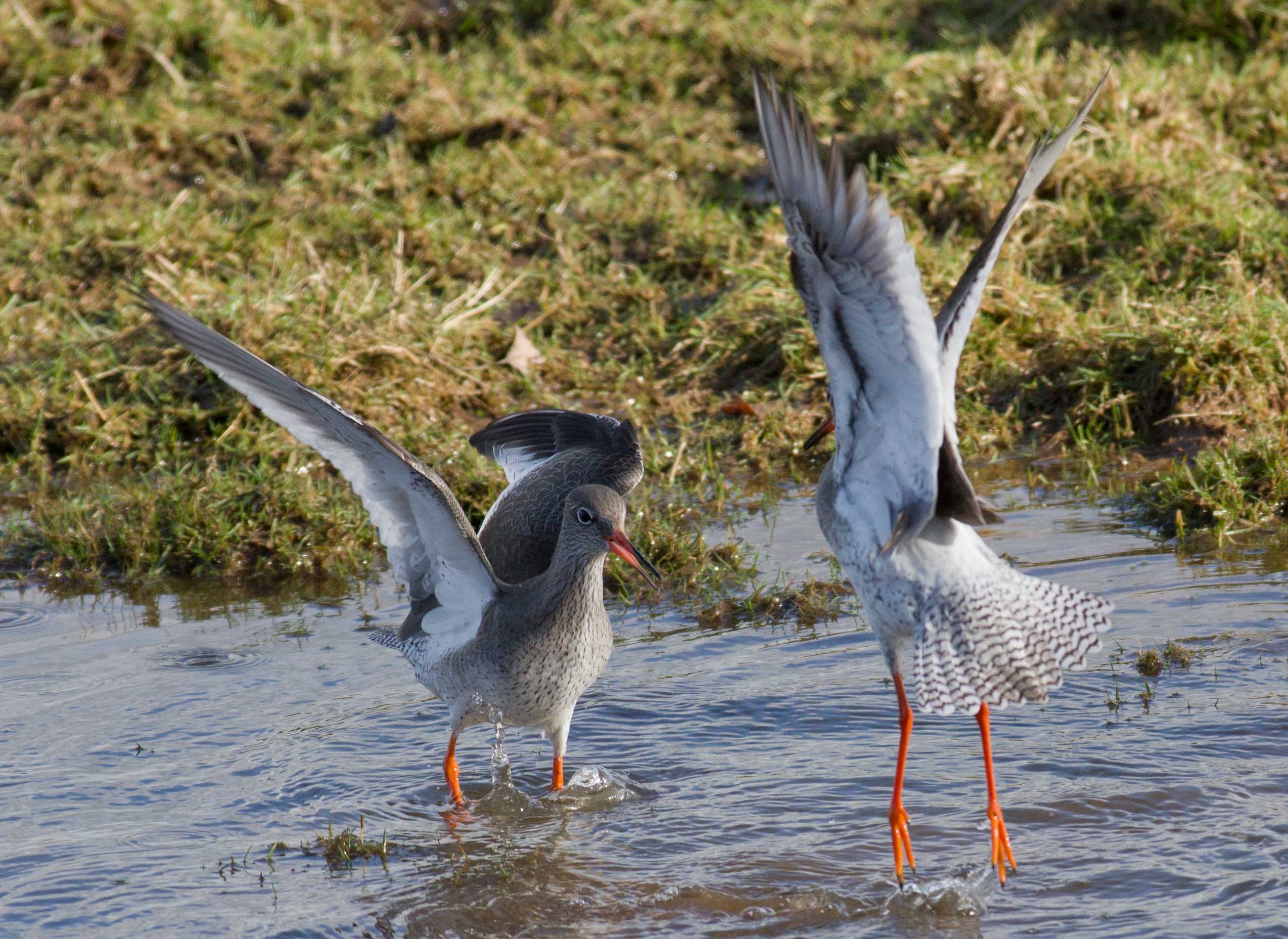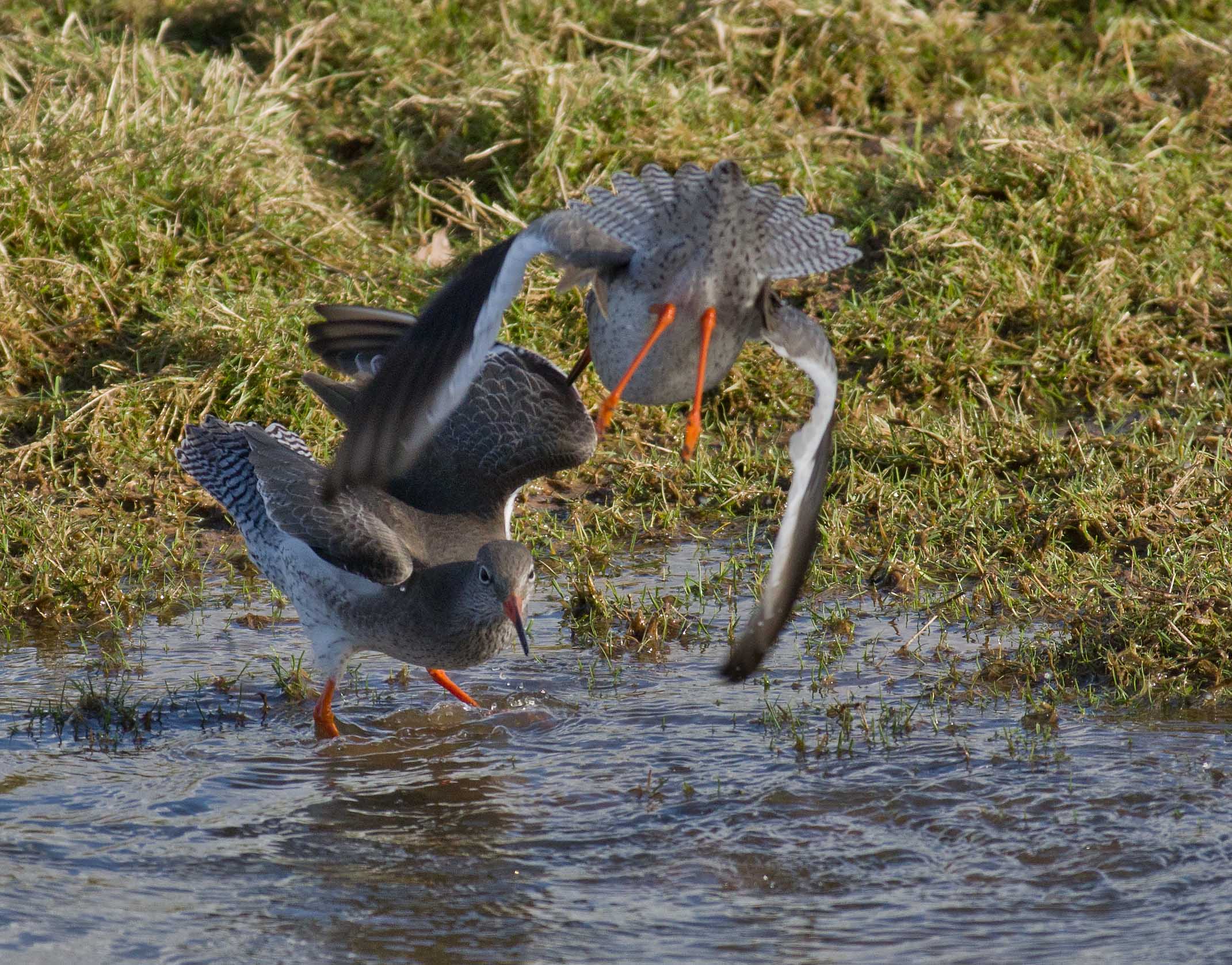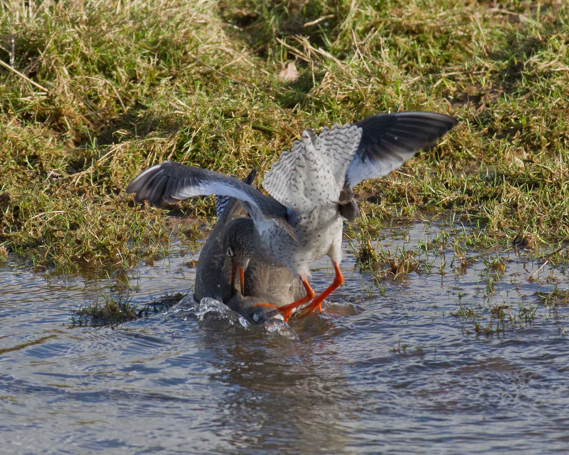 I spent more time yesterday in the public hide at Bowling Green Marsh. It was a bright sunny day, which was a great opportunity for everyone to, at last get out and do something. I was limited to a trip to B G Marsh because I had to use public transport and it was immediately obvious when I got there that I should have stayed at home. Unlike the dull rainy weather on Thursday, when I pretty much had the hide to myself, today it was full to capacity. I have to say that this had a massive impact on the bird behaviour, every self respecting bird keeping as far away from the hide as possible. There was even one"joker" stood outside, within the fence and fully exposed to the birds in front of him. For me it was almost a disaster and I was very disappointed to be honest. It was noisy, very noisy and once when a redshank flew in quite close, the chatter was so loud that the bird immediately flew off again to a safe distance. It's hard to understand, why you would go there to see the birds and then scare them away? I just don't get it. Still each to there own and if you go to a public hide you have to respect that other people are there for all sorts of reasons and not necessarily for the same reason as yourself. I think I take some quite good photos and there is no secret, you need patience and perseverance and also good fieldcraft and a quiet approach. You need to be as close to your subject as possible and you can't get close to a wild creature by making noise and causing disturbance. Eventually people got bored and in the end, after more than two hours, only 3 other people were in the hide and guess what? The birds came in close and were eventually feeding on the grass and in the flood just in front of the hide. Again, patience and perseverance had paid off. The Redshank are starting to come in to breeding condition and from time to time they would display some aggressive behaviour. I could see a situation starting to develop in front of me and I waited whilst one bird postured aggressively to another and then the fight kicked off. A great photo opportunity at last. If you look at the series you can see that one bird gets the upper hand and literally holds the other's head under the water at one point. This all took a matter of seconds and it was interesting to see what was actually happening because the eye could hardly follow the action.
