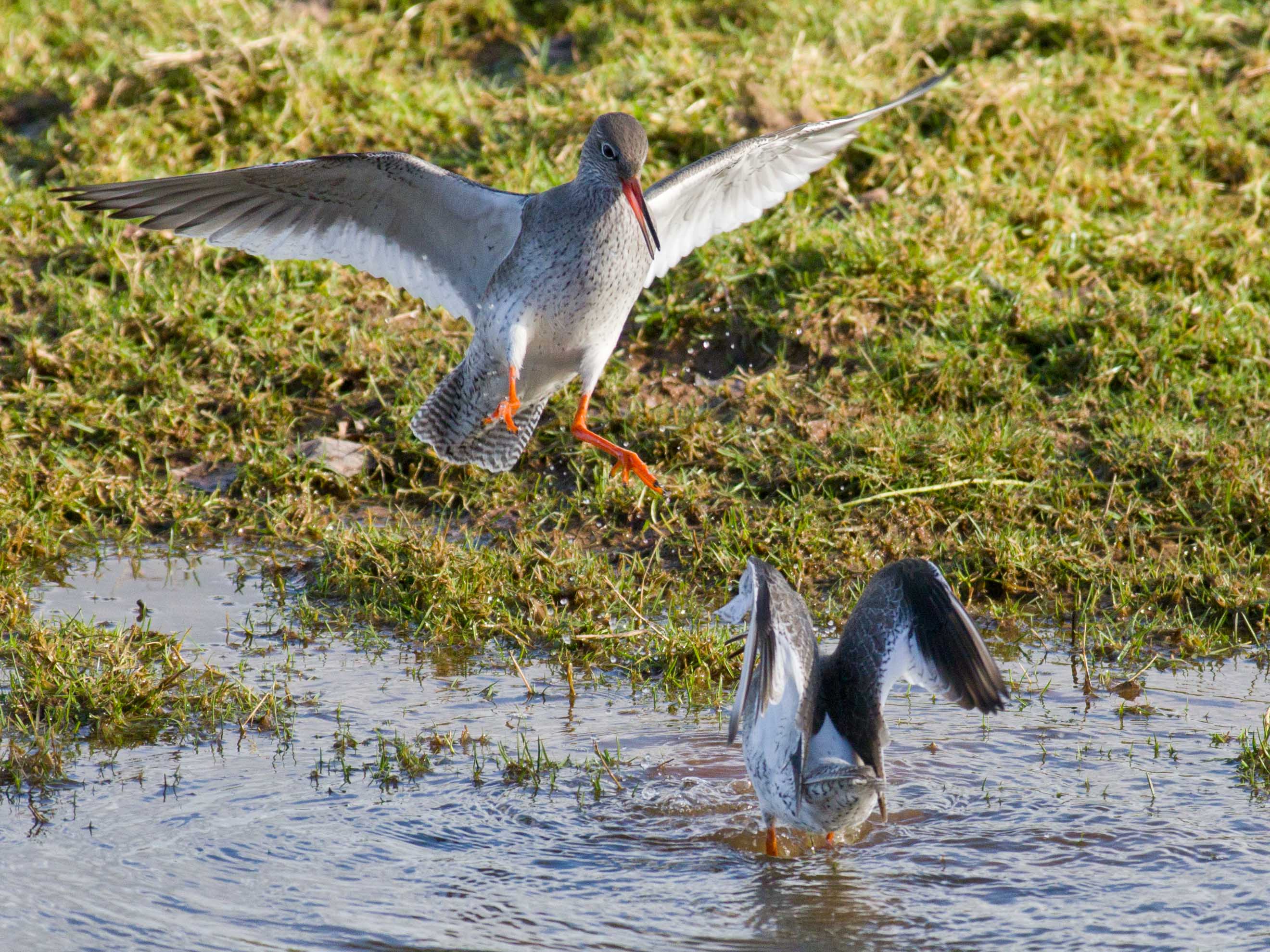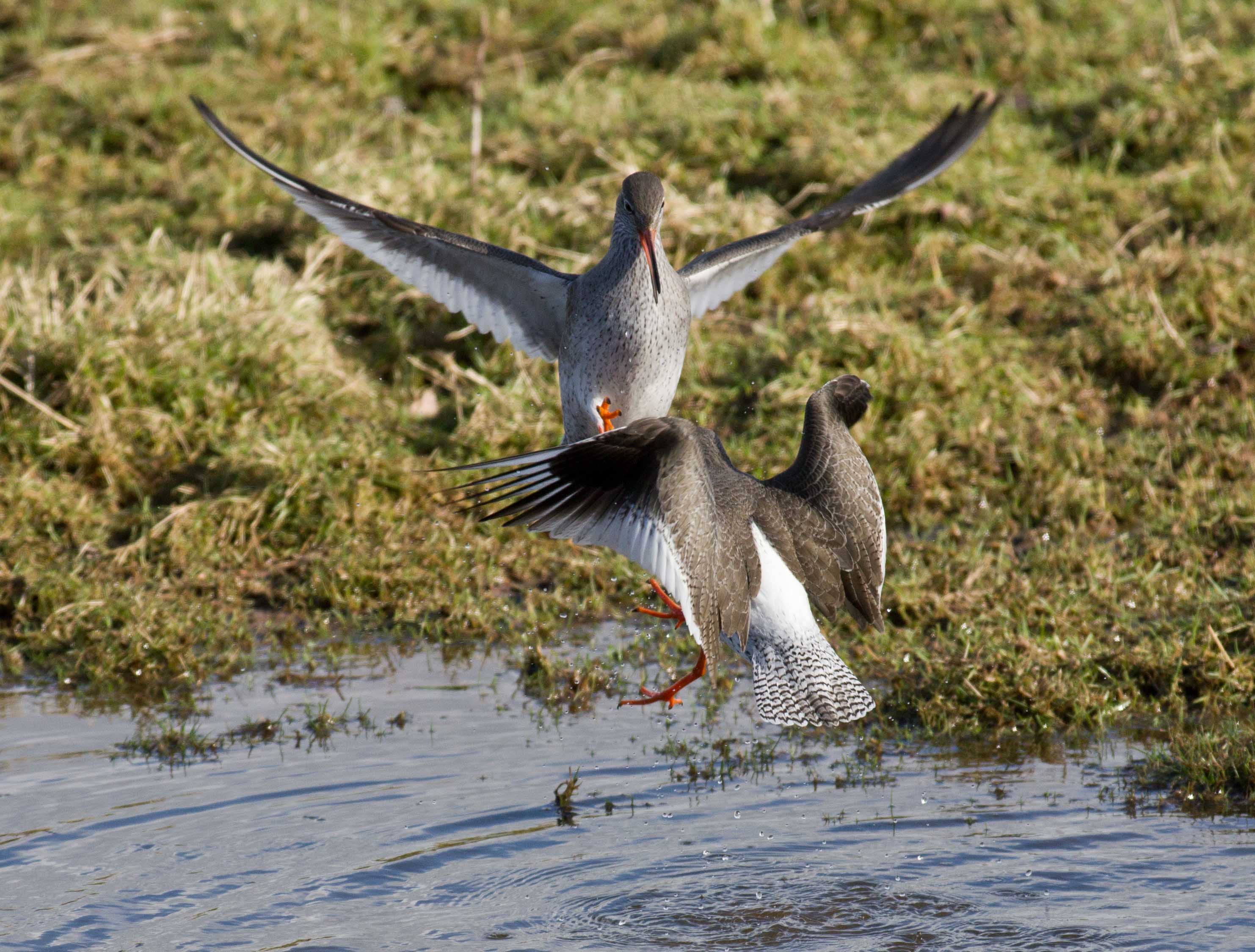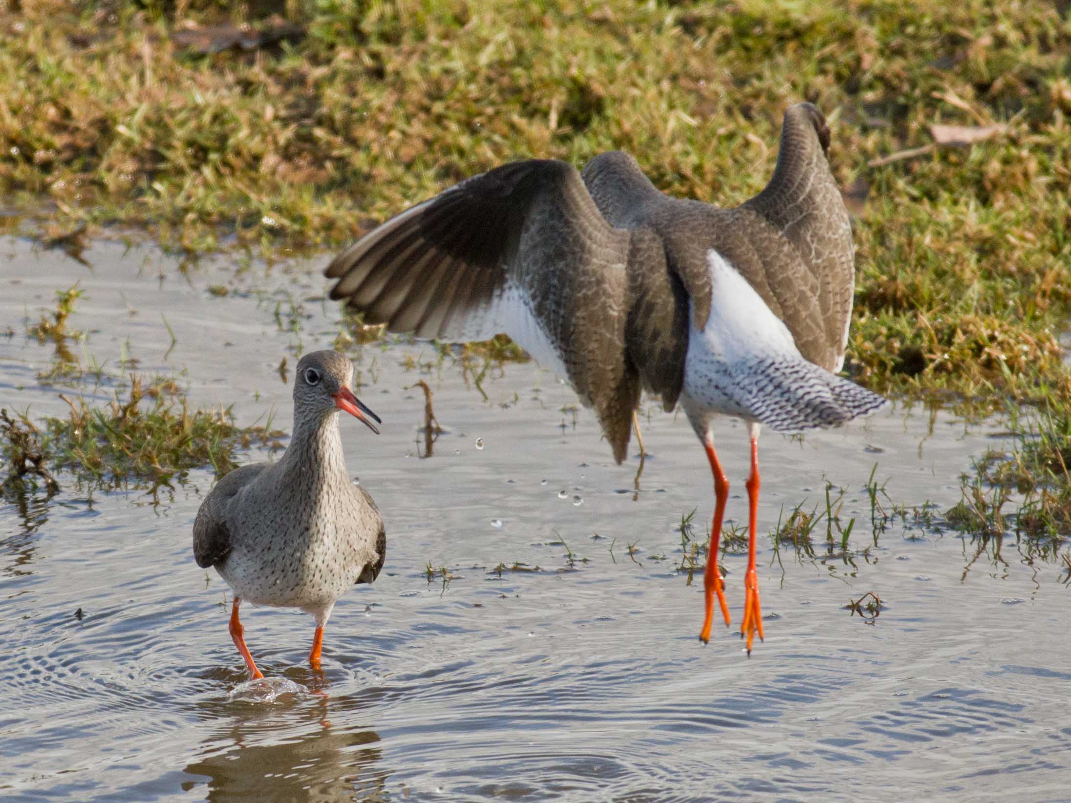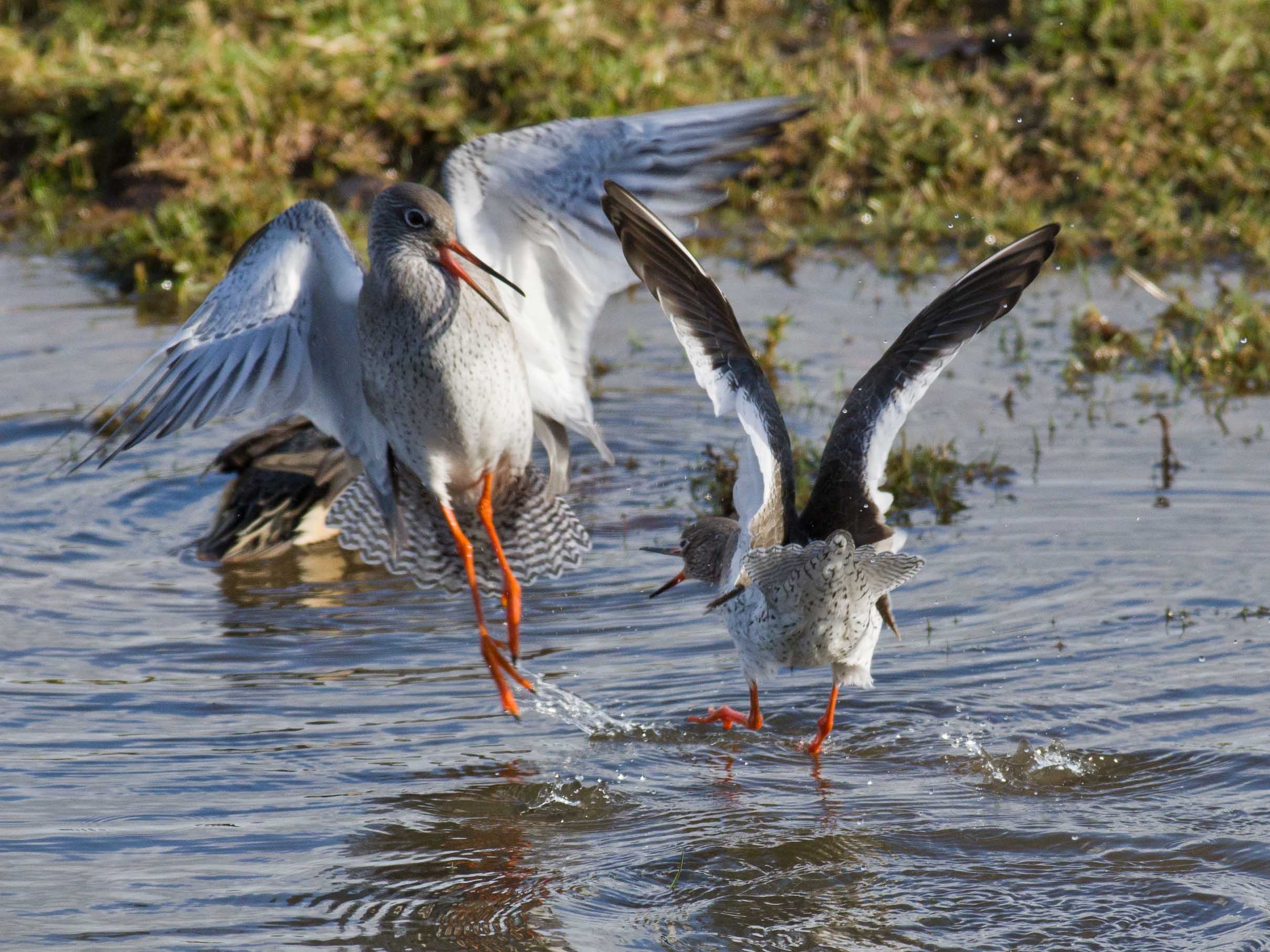 I spent more time yesterday in the public hide at Bowling Green Marsh. It was a bright sunny day, which was a great opportunity for everyone to, at last get out and do something. I was limited to a trip to B G Marsh because I had to use public transport and it was immediately obvious when I got there that I should have stayed at home. Unlike the dull rainy weather on Thursday, when I pretty much had the hide to myself, today it was full to capacity. I have to say that this had a massive impact on the bird behaviour, every self respecting bird keeping as far away from the hide as possible. There was even one"joker" stood outside, within the fence and fully exposed to the birds in front of him. For me it was almost a disaster and I was very disappointed to be honest. It was noisy, very noisy and once when a redshank flew in quite close, the chatter was so loud that the bird immediately flew off again to a safe distance. It's hard to understand, why you would go there to see the birds and then scare them away? I just don't get it. Still each to there own and if you go to a public hide you have to respect that other people are there for all sorts of reasons and not necessarily for the same reason as yourself. I think I take some quite good photos and there is no secret, you need patience and perseverance and also good fieldcraft and a quiet approach. You need to be as close to your subject as possible and you can't get close to a wild creature by making noise and causing disturbance. Eventually people got bored and in the end, after more than two hours, only 3 other people were in the hide and guess what? The birds came in close and were eventually feeding on the grass and in the flood just in front of the hide. Again, patience and perseverance had paid off. The Redshank are starting to come in to breeding condition and from time to time they would display some aggressive behaviour. I could see a situation starting to develop in front of me and I waited whilst one bird postured aggressively to another and then the fight kicked off. A great photo opportunity at last. If you look at the series you can see that one bird gets the upper hand and literally holds the other's head under the water at one point. This all took a matter of seconds and it was interesting to see what was actually happening because the eye could hardly follow the action.
