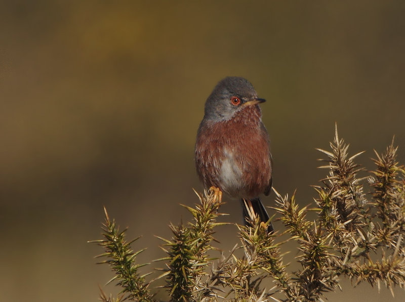 The Sardinian Warbler, another very attractive Sylvia warbler is a bird that I have seen regularly when I have been in Spain, Portugal and the Balearic Islands. Their behaviour is simualar and you struggle to get a view even though you can hear them in the bushes and low shrubs. Suddenly they will show themselves, momentarily, just like Dartfords showing themselves to sing from an exposed perch. In Gibralter many years ago I came upon one that had been hit by a car on the road leading up to the top of the rock. I held it in my hand as it came back to life. I was stunned by the beautiful red orbital eye ring, a feature that it shares with the Dartford Warbler. Heres a photo of one that I photoographed in Menorca in 2012. You can clearly see they red orbital eye ring in bothe pictures.