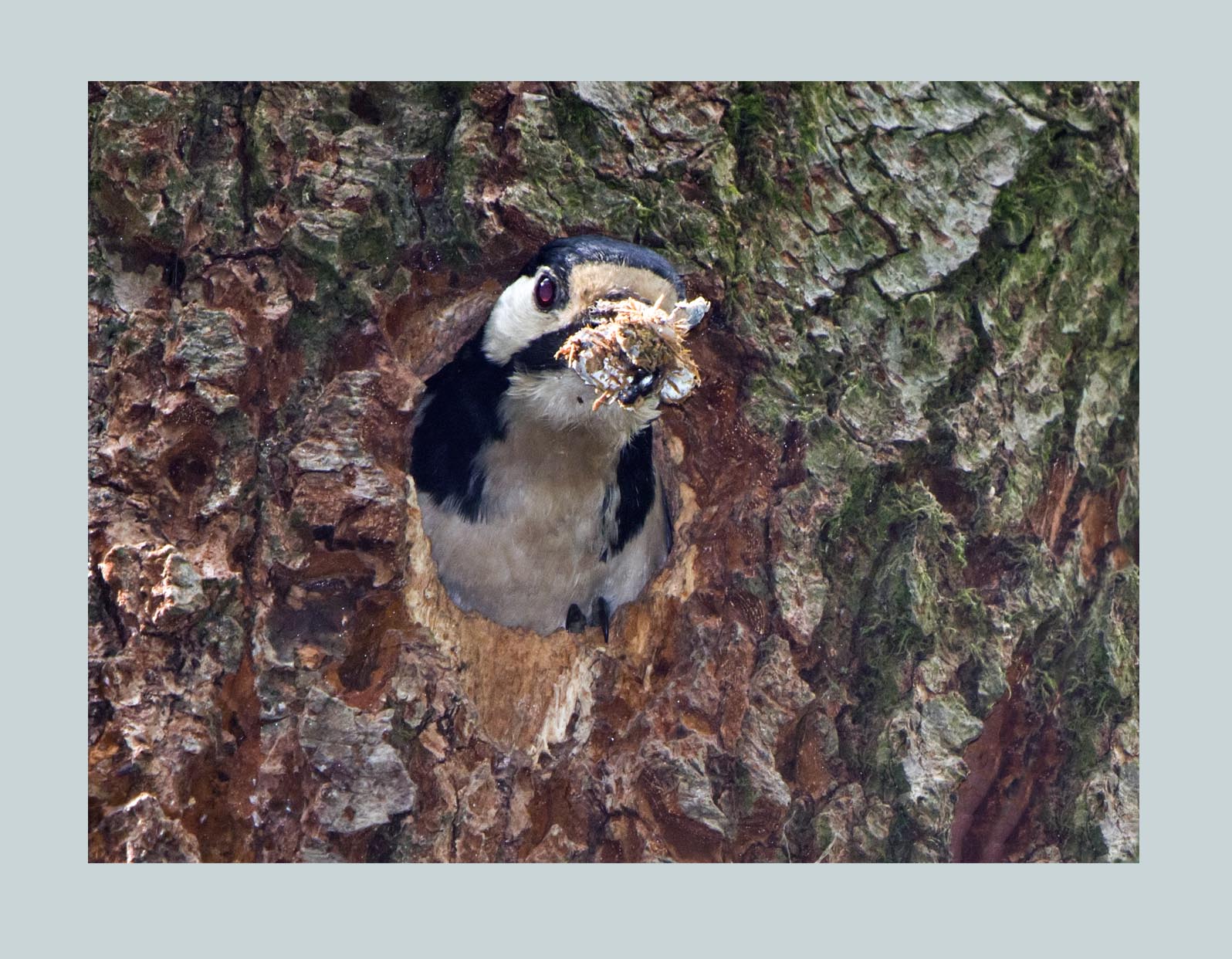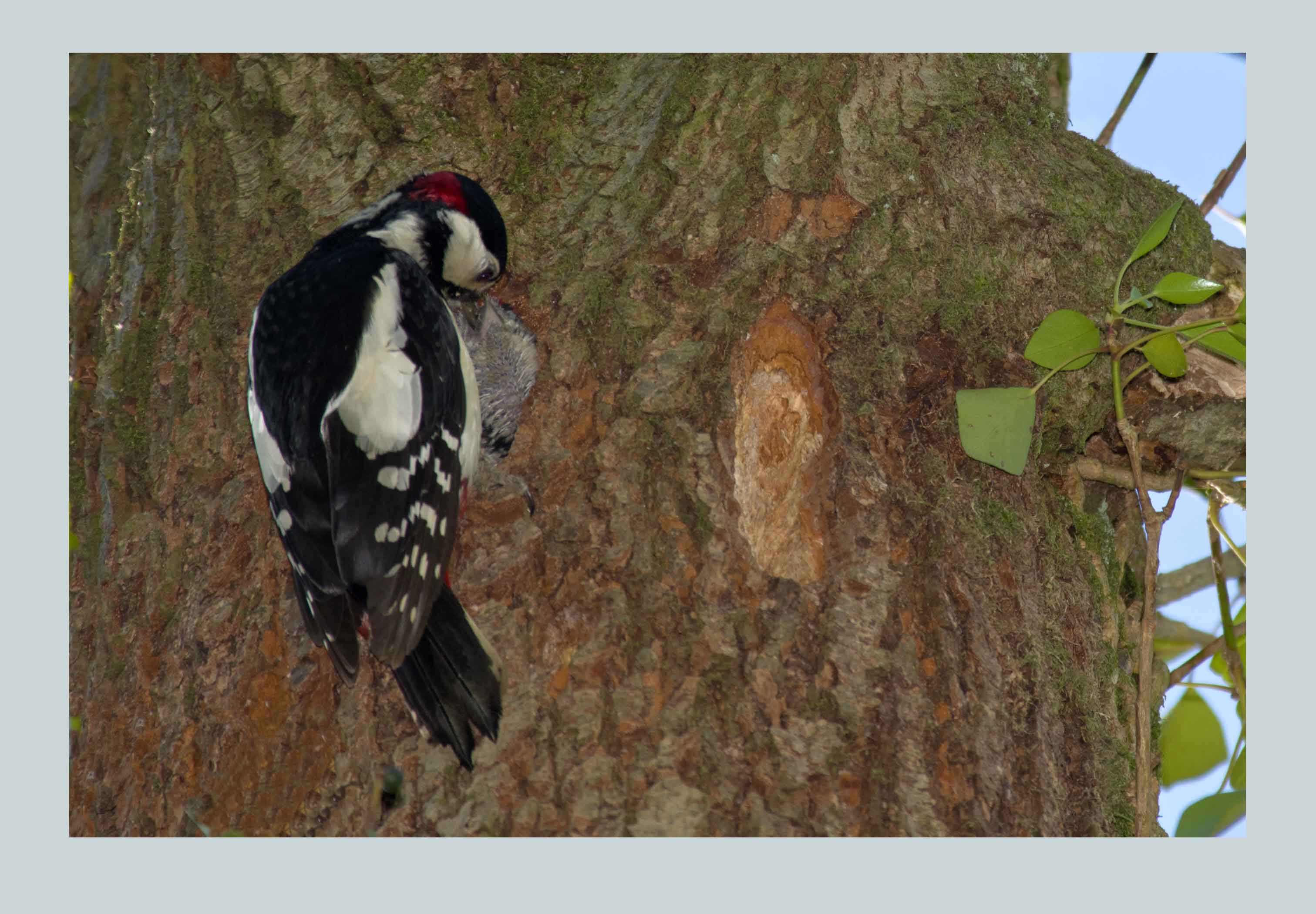 A great opportunity presented itself recently when we discovered an active Great-spotted Woodpecker's nest in my friend's woodland. When they are incubating its quite hard to find an active nest because they are quite secretive. Even though its not hard to find woodpecker holes in trees, some are from previous years and others have been worked on in the current year and then been abandoned when the breeding birds have chosen another hole. I thought I had cracked it when I saw a bird disappear in to a fresh looking hole andwe set up hides to overlook the tree. I spent hours watching but only occasionally saw a bird entering. I put this down to one of the birds spending hours incubating before being relieved by it's partner. Then we realised that we were watching the wrong hole all along because a bird was arriving constantly and entering a hole much higher in the same tree!
