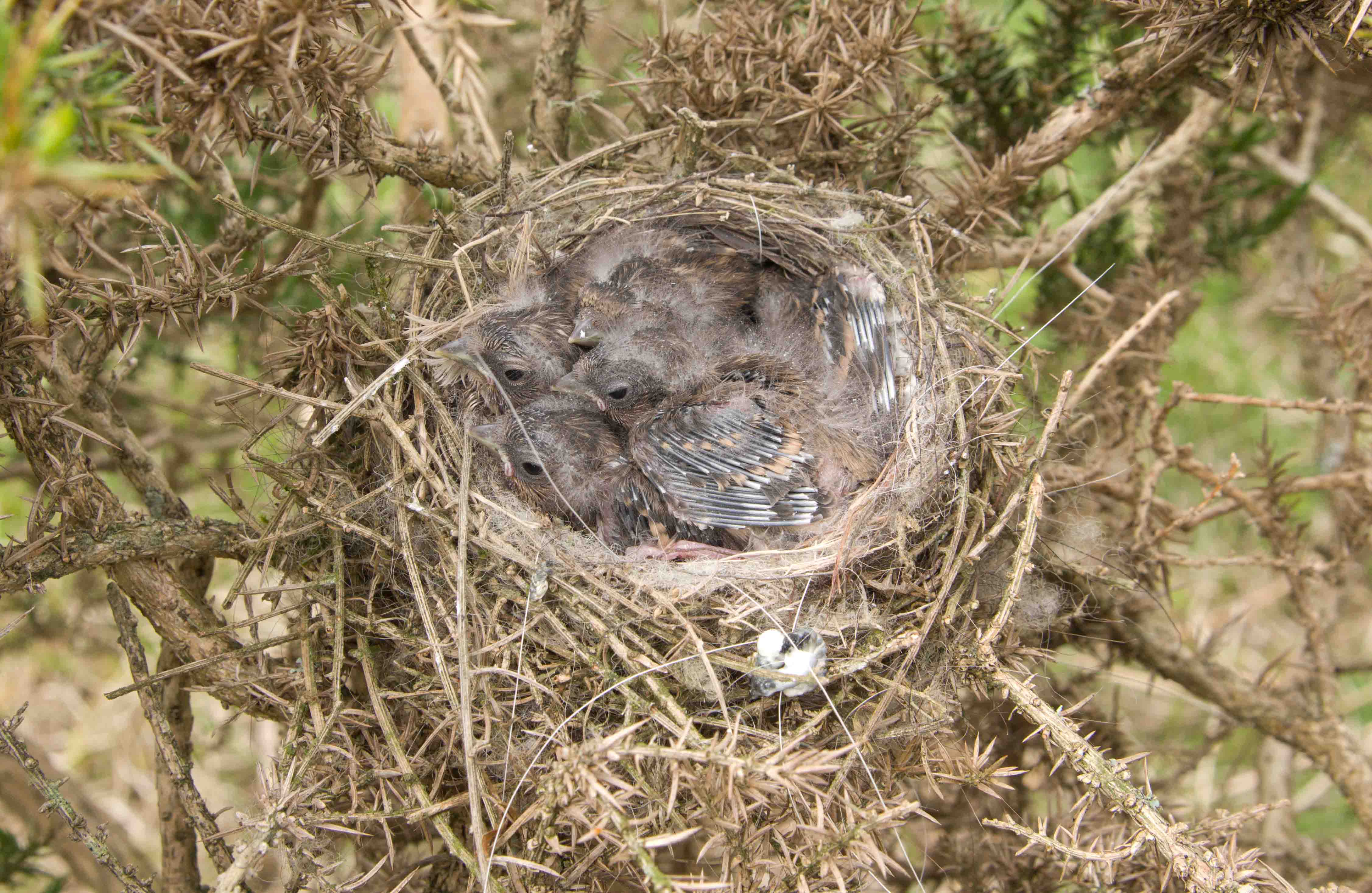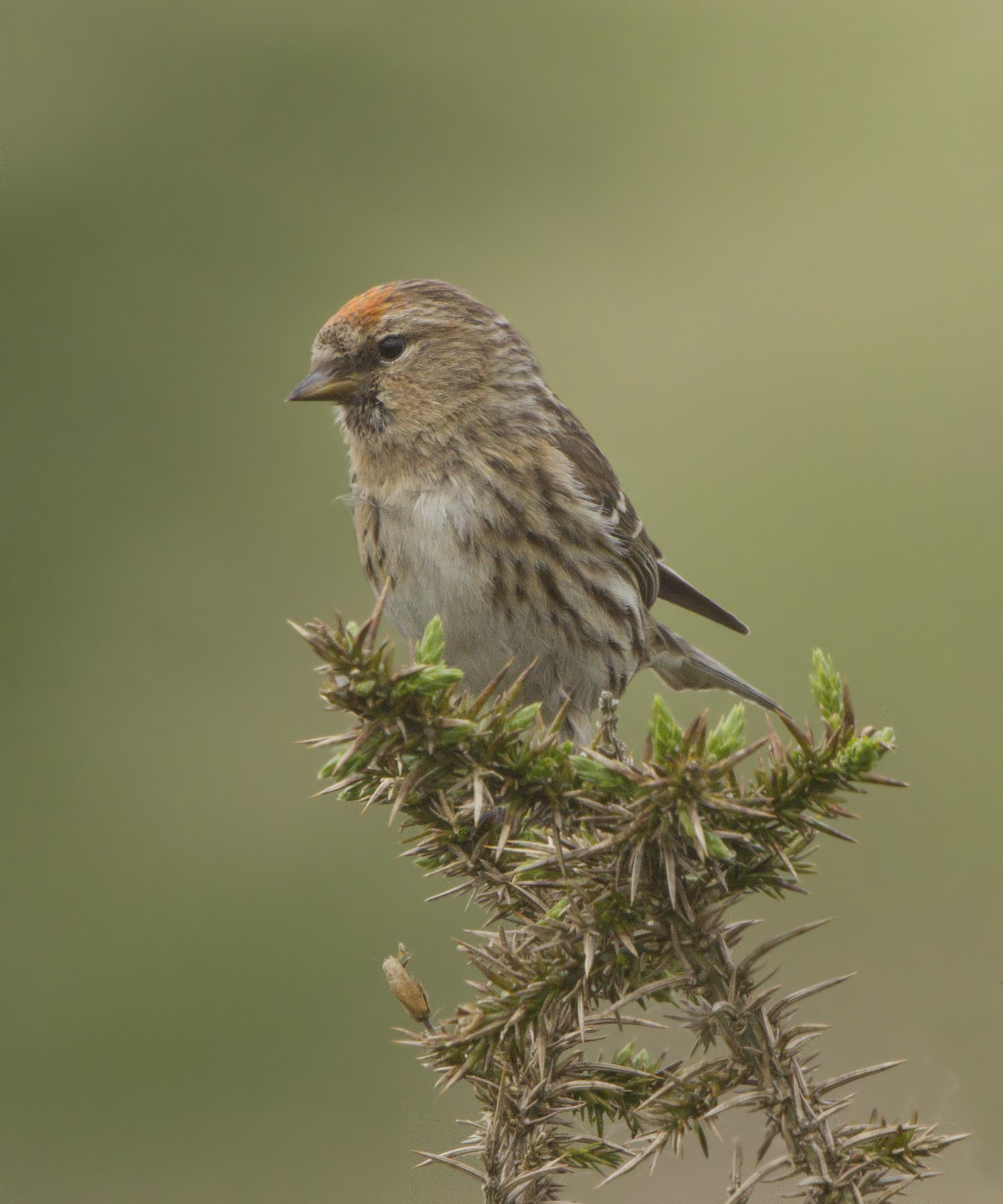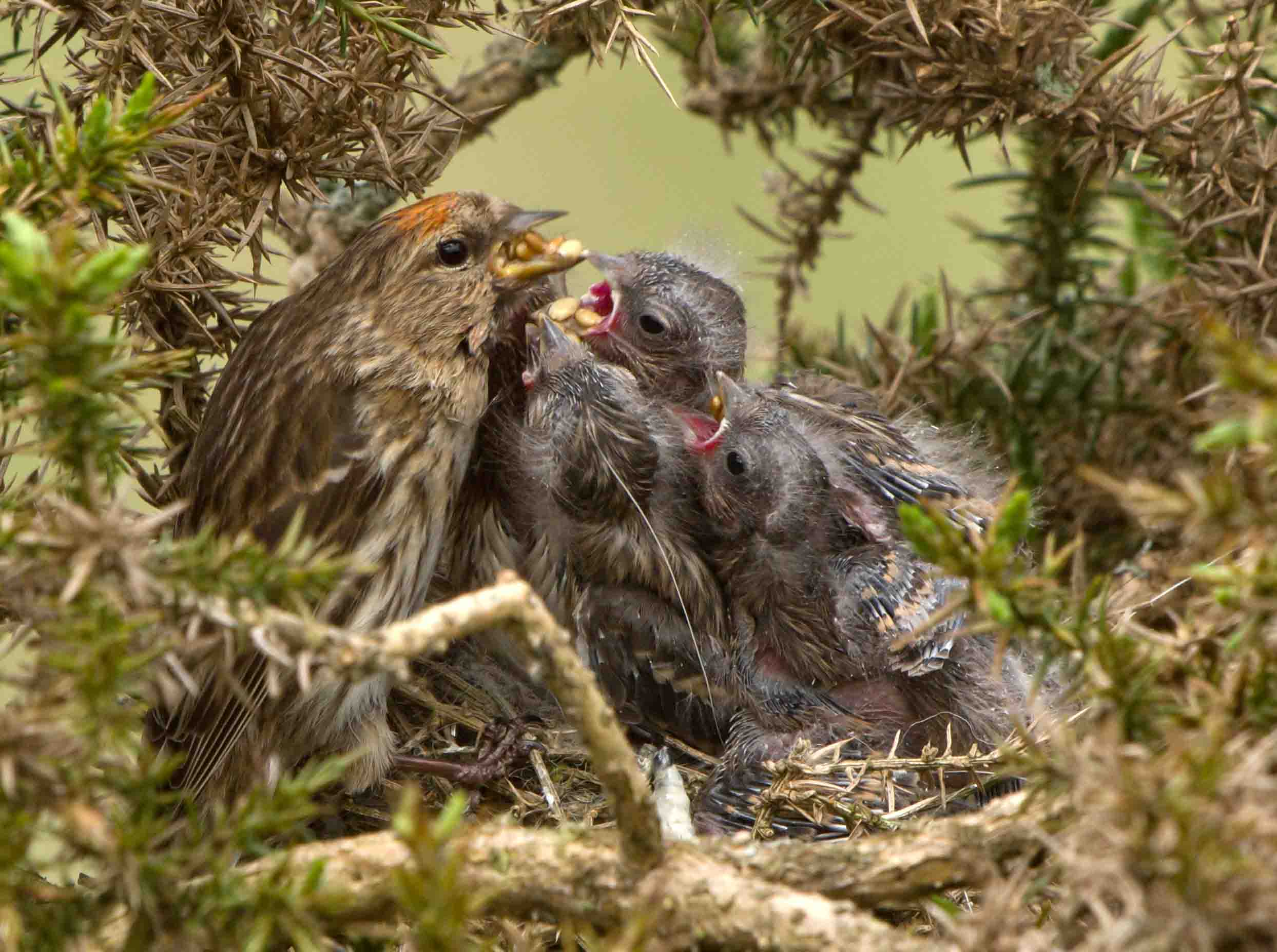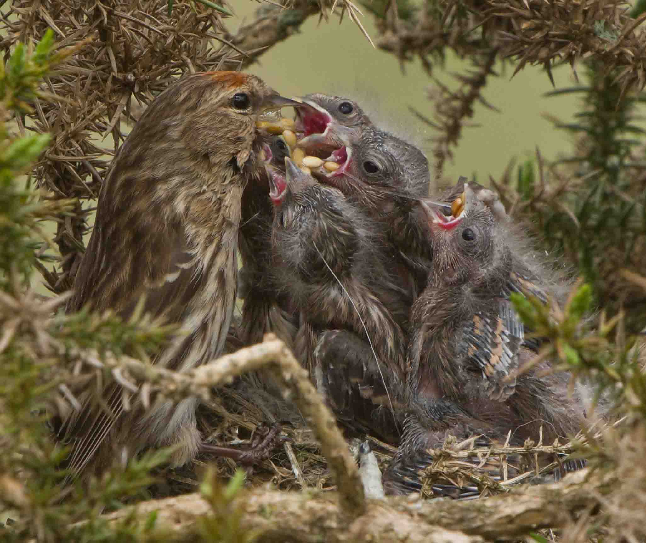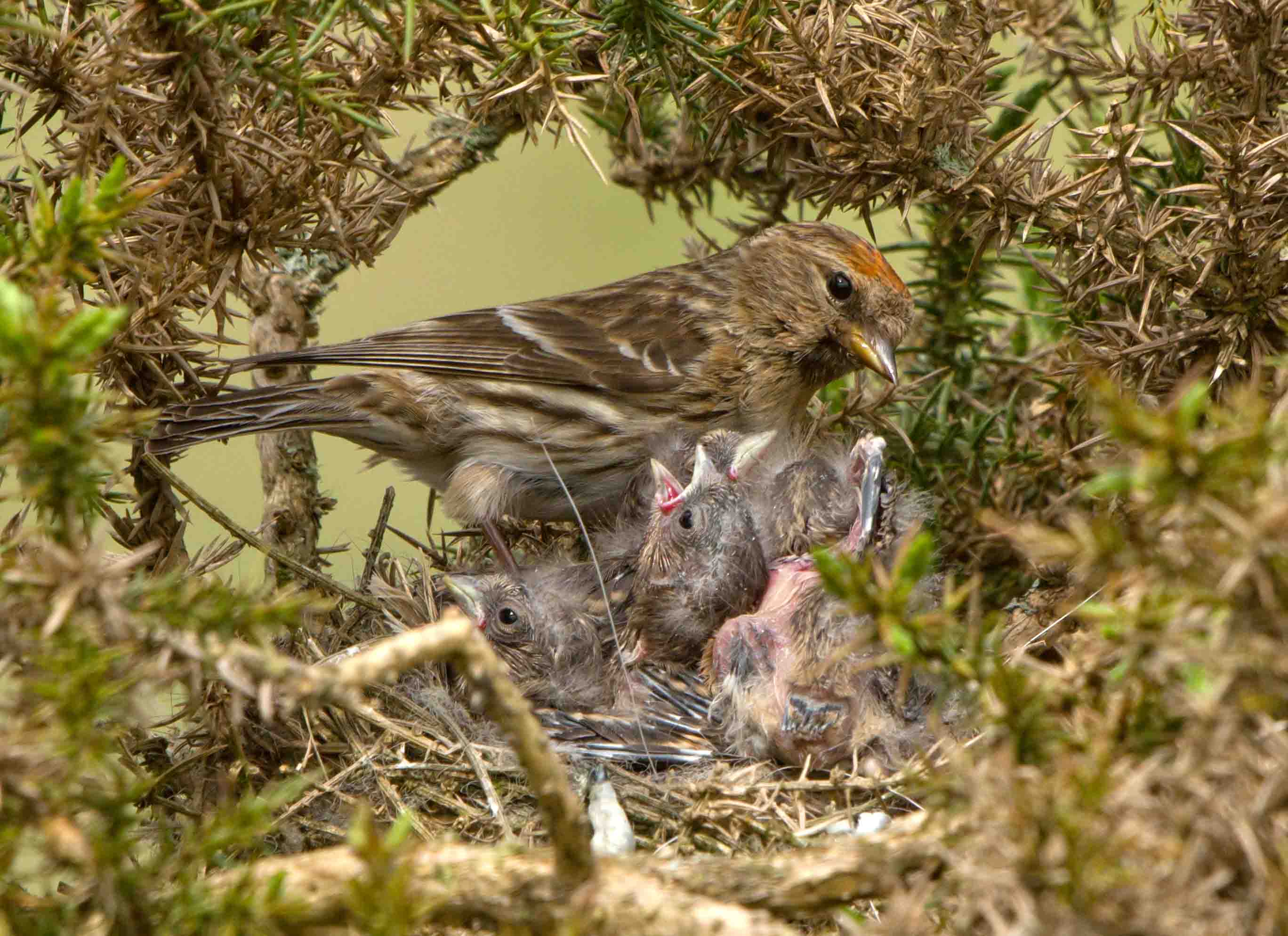 If you look back at my previous post you can read about how I managed to have the great pleasure of photographing at Lesser Redpoll nest. Today I made my way out to the site and set up in front of the gorse bush where a nest contained five healthy juvenile birds. I quickly checked that the birds were OK and had survived the last 24 hours, I was pleased to see them. . Before I left yesterday I had discovered that if I positioned the tripod very low and in the exact spot, I had a clear view to the nest which is basically a cup in the fork of the bush and quite high up. I used cam netting and vegetation from the vicinity to fashion a crude, but very effective hide and then tucked myself in with a gillie suite hood on just to make sure. I had great view of the chicks in the nest and It was only a matter of minutes before the female came in to the bush, called for a while from on top (see above) and then approached the nest carefully and quietly from beneath.