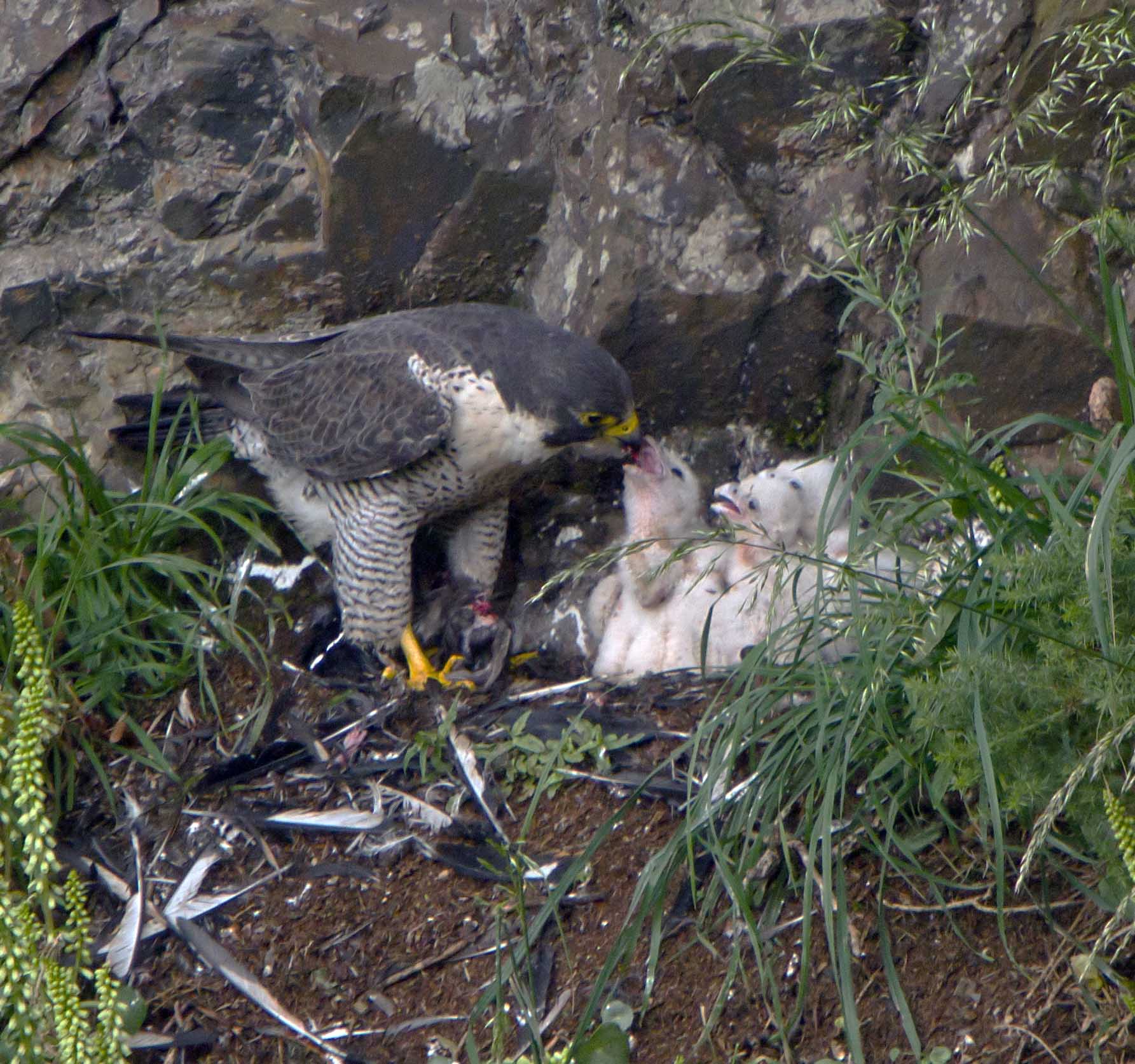 When the chicks first hatched it seemed that they were fed three times a day and this continued for the first week. Now feeding has increased dramatically and they appear to have food brought to them every 2 to 3 hours or so. Prey items have included Great -spotted Woodpecker, Magpie, Bullfinch, Swallow and Blackbird with a couple of kills unidentifiable due to the plucking that takes place off the nest quite often. If the falcon is impatient she will grab the kill from the tercel and complete the plucking on the nest ledge making it easier to identify the bird.