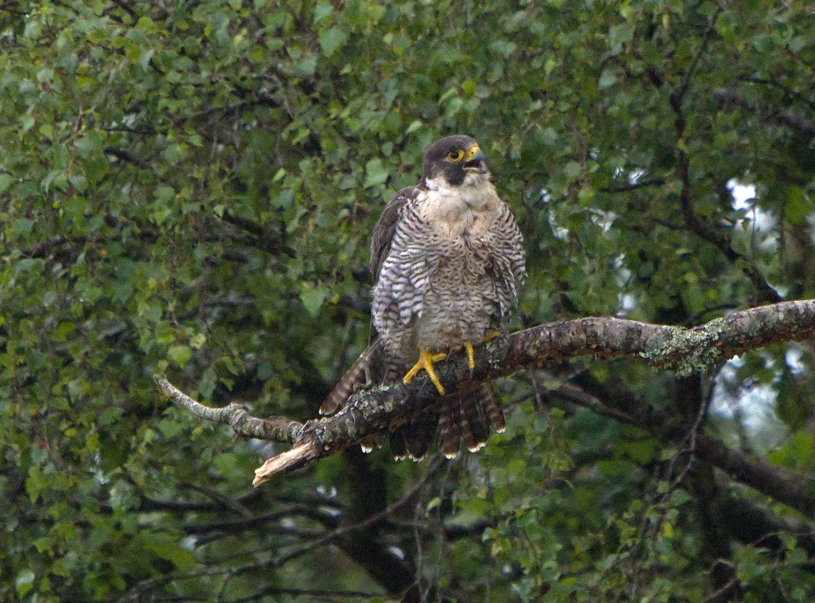 The male is not seen all the while at the site and on the face of it, he seems to have an easy time. He never visits the nest ledge alone. I never saw him incubating this clutch of eggs, but I did see him on the first failed nest. He has taken no part in the brooding of the chicks when I have been watching. However, he has caught, to my knowledge, all of the prey for the three chicks. He rarely delivers his kills to the nest but instead he will perch on a favourite tree or opposite and scream to the falcon who will come to him and take the prey. Thi is quite often preceeded by her screaming for him to bring food. I am told that his duties will include patrolling the large territory and he will have favourite perches well away from the nest site.