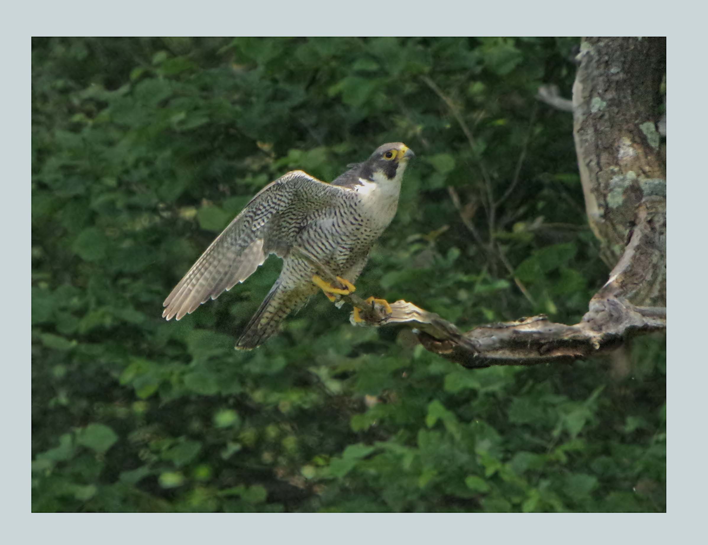 The time between feeds is quite long, the chicks were fed just after 11 and it's now coming up to 3 o'clock. Digestion of a meal is relatively slow which would account for the extended time tween feeds. The chicks do not require brooding now either and therefore there is relatively little to observe at these quiet times. The falcon returned briefly a while back, she perched on her favourite branch in a most unceremonious way, misjudging her landing and giving me a good photo opportunity. Apart from that, it was all very quiet today.