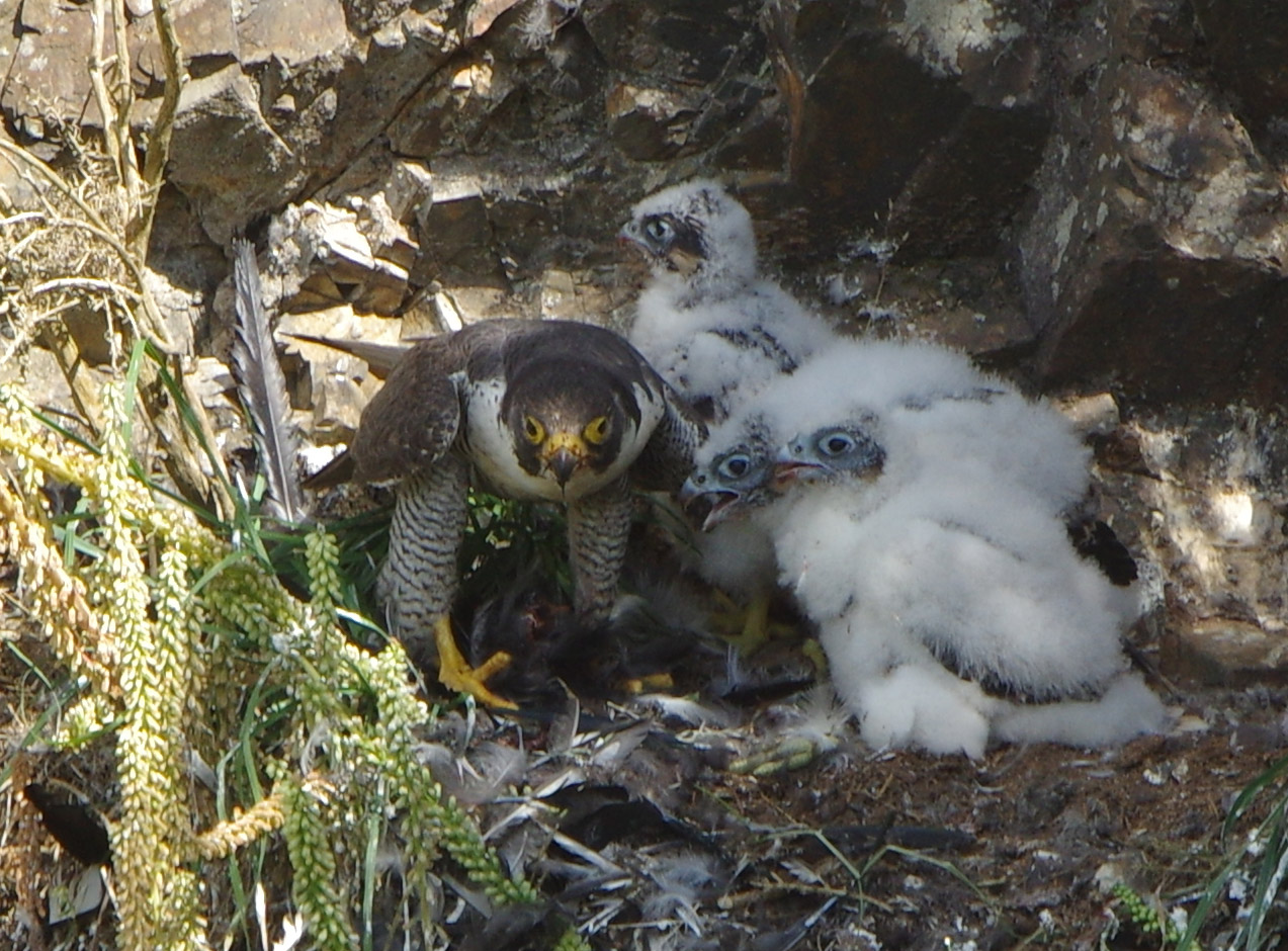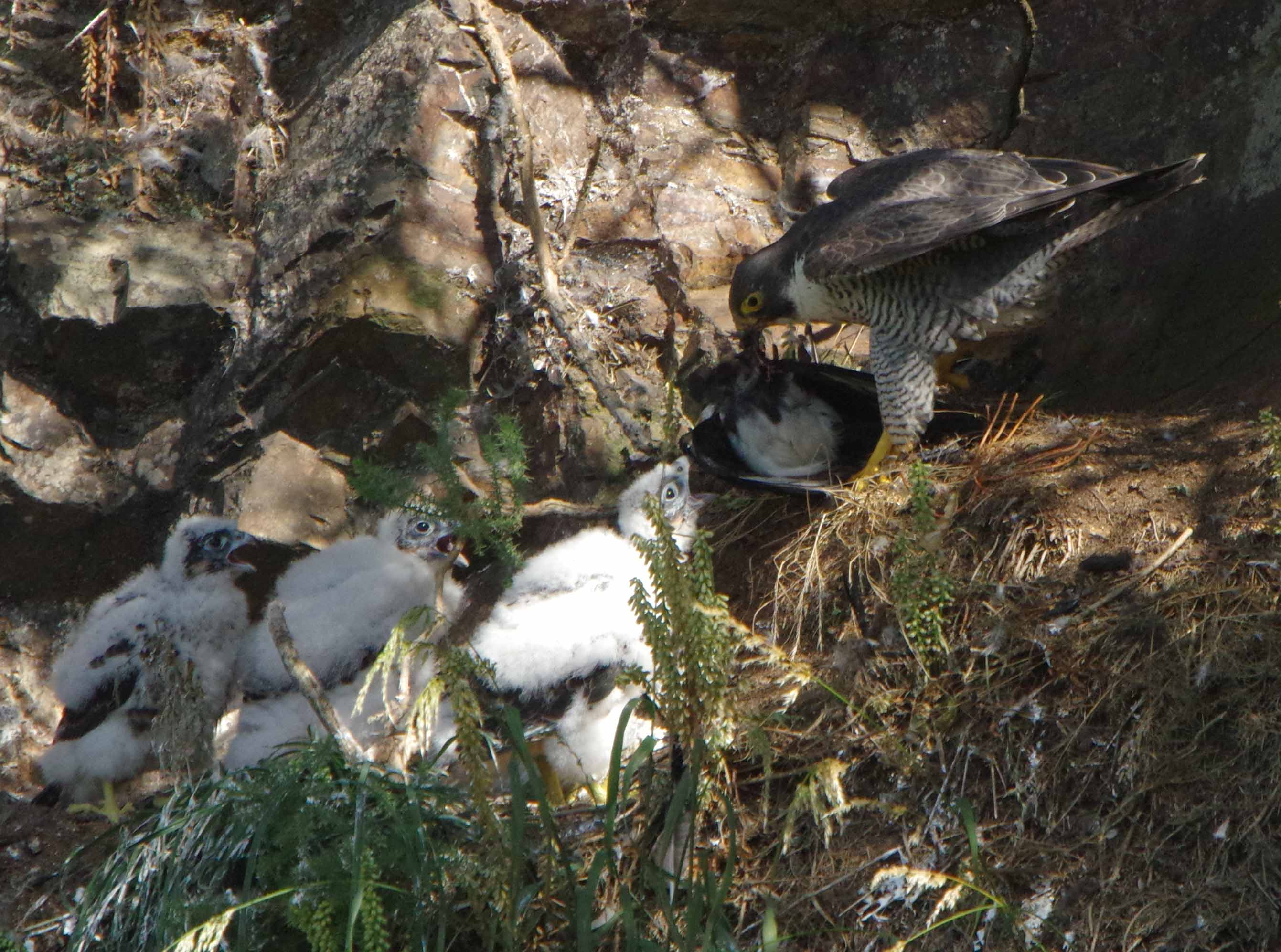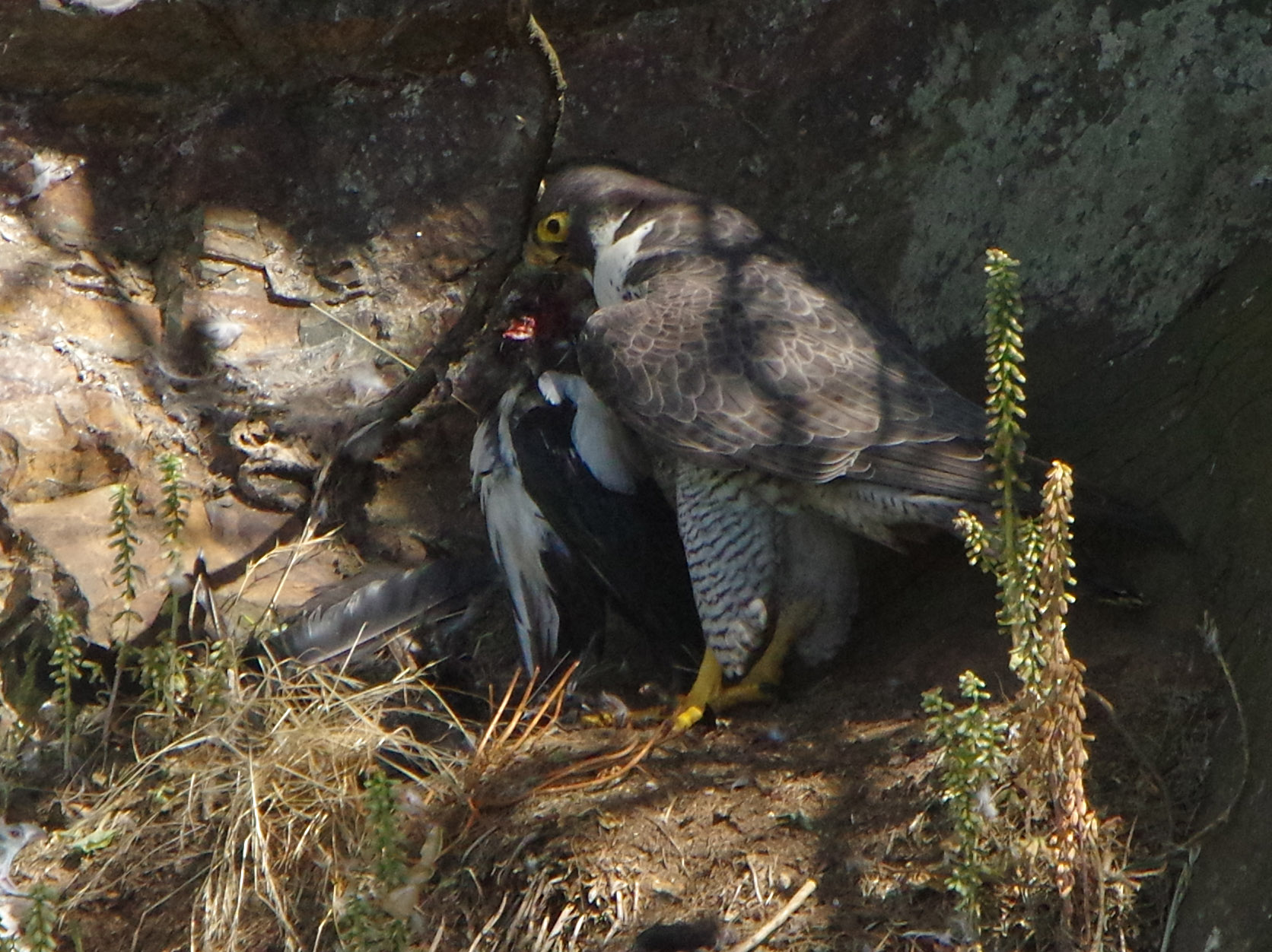 The young Peregrines are 28 days old tomorrow, no longer looking like tiny defenceless chicks but bigger and stronger than ever. I watched one feeding itself like an adult earlier and it's almost incomprehensible to see how they have developed in such a short time. They seem now to have a body bulk at least as large as the tercel and look plump and well nourished. Still predominantly white with down, they have the makings of a proper tale and wings to match. I was incredibly lucky when I arrived, almost immediately, prey was bought to the ledge by the falcon. This time it was a Magpie, this seems to be a large part of the falcon's diet, I have seen 4 as prey now. This kill was an adult, the chicks made short work of consuming it. On this occasion he fed it to them.