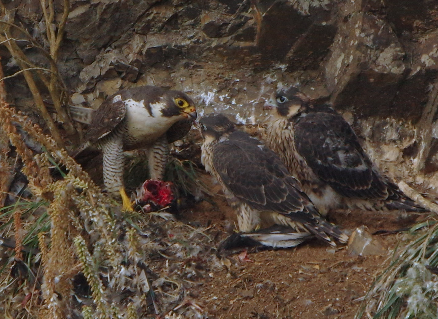 Quite a dramatic difference in the appearance and size of the two oldest chicks now. Their sibling which at 34 days, obviously a falcon because It is even larger but is not as developed as the older siblings with still lots of fluffy down evident. In the image here the bird being fed appears to be a young tercel. It will not be many more days before this one fledges the nest ledge. I was quite surprised to see the falcon feeding the chicks today. this is the first time for several days that I have seen the chicks being fed. Prey has been delivered to the ledge and the chicks then left to fend for themselves. This seemed to be what I have observed before and I have a theory. The tercel catches smaller prey at a size that the young eyass can cope with whereas the falcon being a much bigger bird, catches larger prey such as Magpie and other corvids.