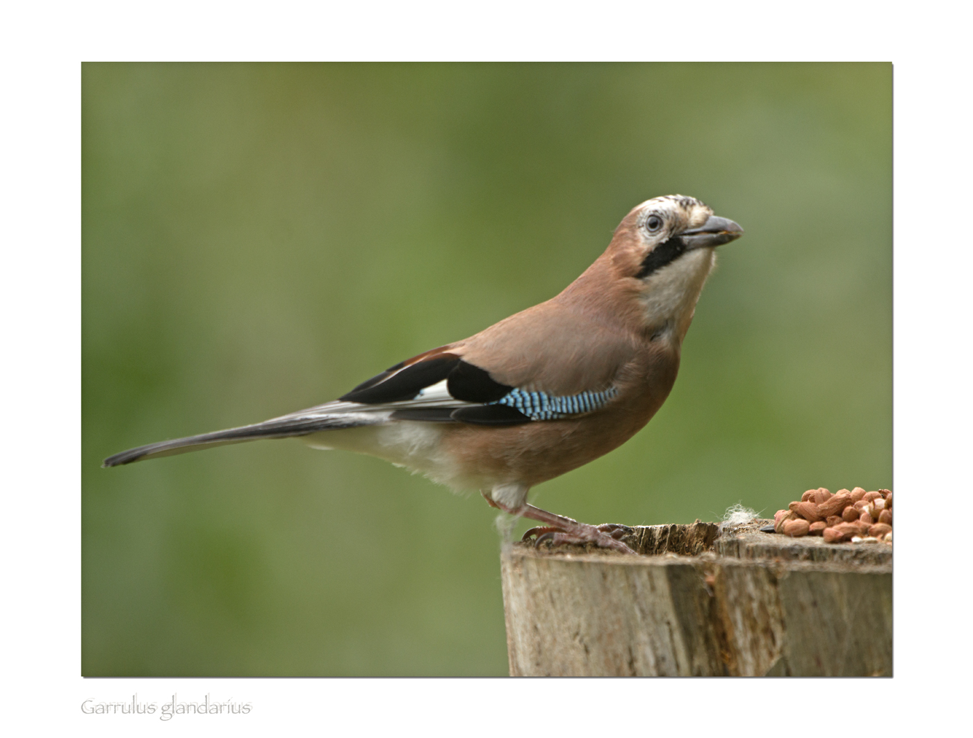 After 2 hours and without any success yet, I suddenly heard a Buzzard quite close and I got ready for what I imagined was going to be the arrival of a bird of prey to the bait. But I was duped! There, on a pile of peanuts was an old friend a "buzzard imitating" Jay! This has got to be the same bird that has been coming to my peanut offerings for three years now. It was in 2012 whenI first realised that all was not what it seemed and quite often the sound of a Buzzard was in fact this bird. He filled up his crop with the usual 20 or so peanuts and then off he went to stash them somewhere as Jays do, calling like a proper jay as he went……..and still no Buzzardso far.