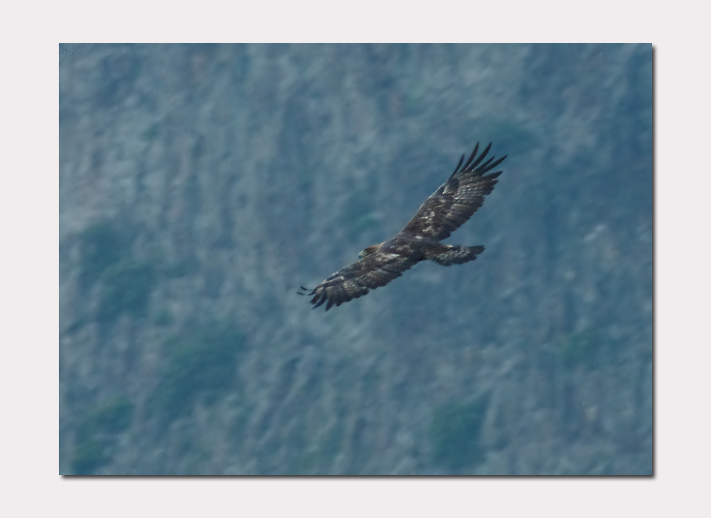 Darkness arrived last night at around 1900 and what else could I do than get my head down and sleep. Surprisingly my night was no better or worse than normal and my 5 layers of shirt proved to be one too many! in other words I wasn't cold! It was weird being out in the wilderness, up a mountain, totally isolated and with wolves potential only feet from me. A few bangs and bumps in the night were slightly worrying but I not too bad. When dawn arrived I just literally sat up on the bunk and began to watch. In the half light. The excitement was already here, I could see what I thought to be a wolf but quickly realised it was a red fox, oh well! (However it was very likely that there was also a wof present having spoken to Marin later). Then a massive bird flew in followed by another that landed on the rocks above the cow parts scattered around. I dived off the bunk to the camera……a Golden Eagle! Marin had told me that Eagles will grab food and leave immediately and this is exactly what happened but as it flew down the valley, I photographed it in flight with the camera doing a half decent job in the very low light.
