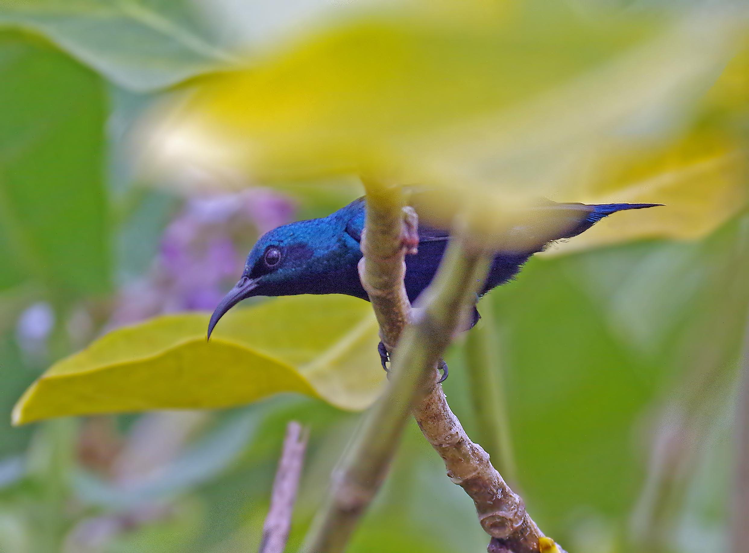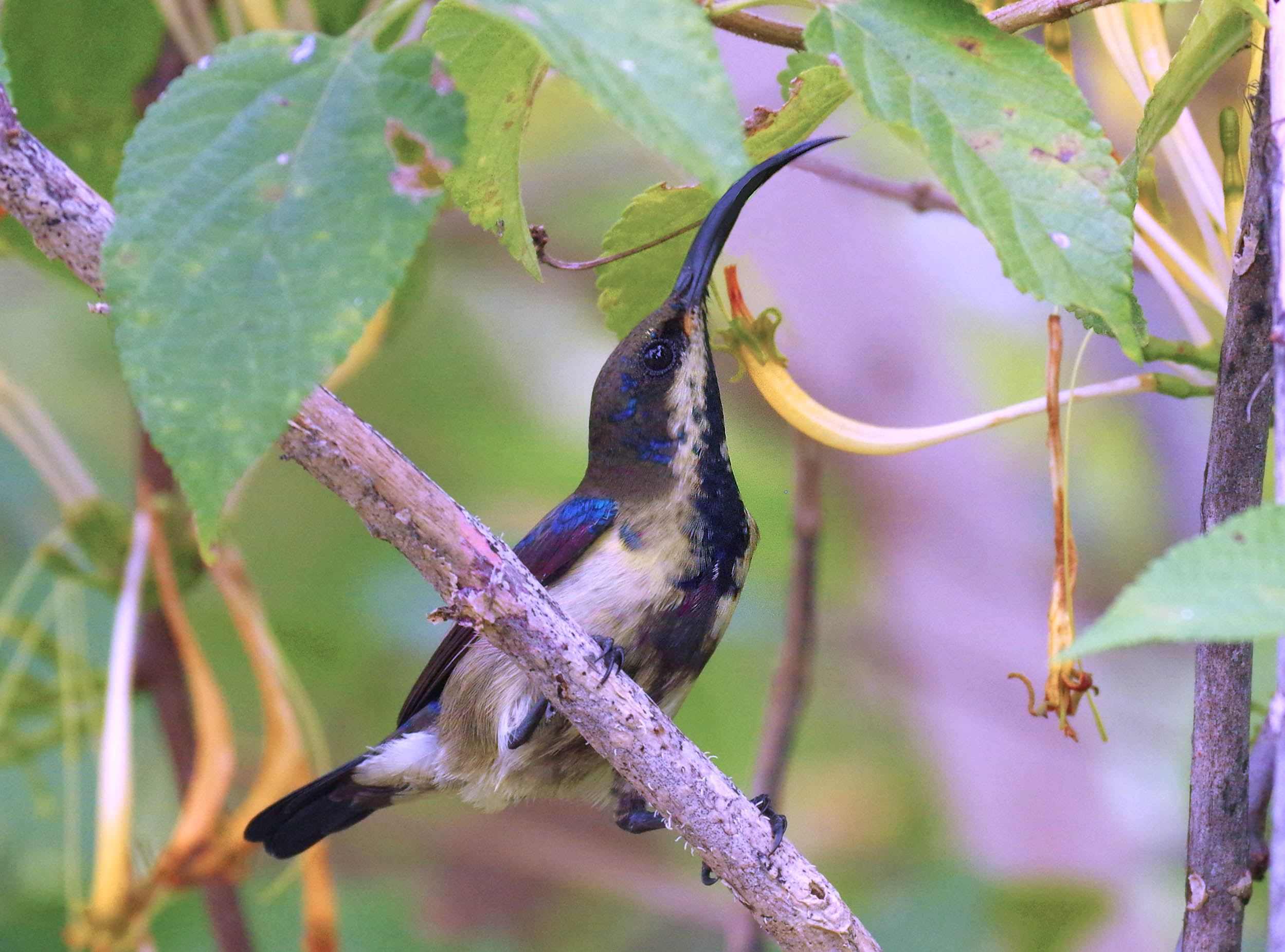You can see in this picture that there is a large amount of adult colouring down the breast. But compare the two species in the photo of the Purple Sunbird in the same bush and you can see that the profile is noticeably different in both birds. Note how much longer the beak is in the Loten's. (By the way Loten was a Dutch naturalist). A great morning session and if anyone ever wonders why I vist Sri Lanka on my own and spend time away then here is your answer,