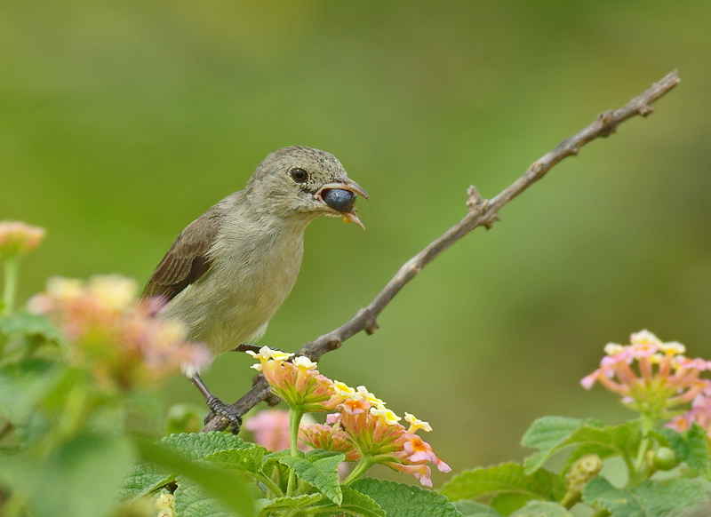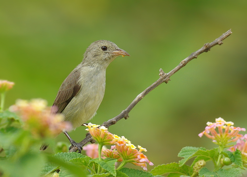 This is a tiny species, just 8cm long, around 3 1/2 inches. It is the Indian sub-continent's smallest bird species. They are quite a common bird in Sri Lanka but I hadn't seen them before my recent trip when I encountered them on three occasions this time. It seems that they are related to the Sunbirds but feed in a totally different way. Each time I saw them they were around, or attracted to the small wild flowering shrub called Lantana, (see above). This little plant is common in hot climates and in other parts of the world, where it is considered to be an invasive species and cleared. Judging by the amount of insect and bird life attracted to the shrub, it would seem wrong to eradicate it but understandable. For the same reason and In the same way that Ragwort is cleared in the UK, Lantana is also poisonous to livestock and here is the problem of course. Lantana is spread and propagated by the Flowerpeckers who feed on the pulp of the seed, discarding the pip to germinate nearby and there is an important relationship between the bird and the plant. You can see in the picture that the Flowerpecker is in the process of dealing with a seed.