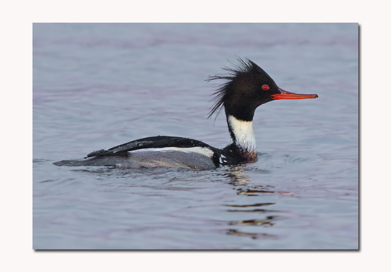 It was almost dark when I took this picture, at around 4,25 this afternoon. I had returned to the spot at Turf on the Exe where yesterday I had seen that the Plovers, Dunlin and Lapwing were using the old posts there to roost at high tide. The problem today though was that high tide was one hour later and this meant that I almost ran out of light before the birds came in to their roost. You may, or may not be aware that wading birds don't roost at night but rather roost at high tide. So with the sun set coinciding with high tide is not all that regular. I tucked myself in the hole and covered myself with cam netting and then sat and waited for the tide to come in and for the birds to come and roost. As you can see one Plover arrived just before the light finally faded and I took the opportunity to get at least some photos. I am quite sure that when high tide coincides with a sunny afternoon again in a month or so, I am going to be able to get some great photographs of the waders here. As I sat and waited I was pleased to see Red – crested Mergansers fishing in the rising tide and quite close to shore.