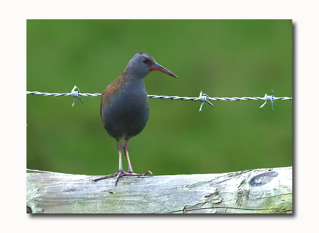 The weather was dreary today, another example of our less than wonderful met office getting the forecast wrong, how many times have you heard me say that. Sunny spells were forecast and instead, we had very low cloud and at times, fine rain. Why is it so hard for them to predict the weather I wonder? So, it was a case of going out and making the best of it or sitting indoors all day long and in the evening too. I went out to look for the Great Grey Shrike that has been on Aylesbeare Common for the last few weeks. It had been seen up there today so there was a good chance that I might see it. When I got there it was even more damp and dank so I didn't linger for too long after a cursory look had drawn a blank. On my way back home I popped in to Darts Farm just to see if there was any sign of the Penduline Tits that I have yet to photograph but I think it will be just a matter of time if I visit often enough. I stood chatting to an interesting young man, just killing time really and as the afternoon turned in to an early January dusk, the resident Water Rail popped out and put on quite a show, eventually jumping up to perch on the fence. It stayed there for a good 2 minutes before hopping down again in to the open in the field. By now, even with my camera set at really extreme levels, (1/100s f/6.3 at 500.0mm iso3200), only one of the dozens of photos was just about OK and worth posting.