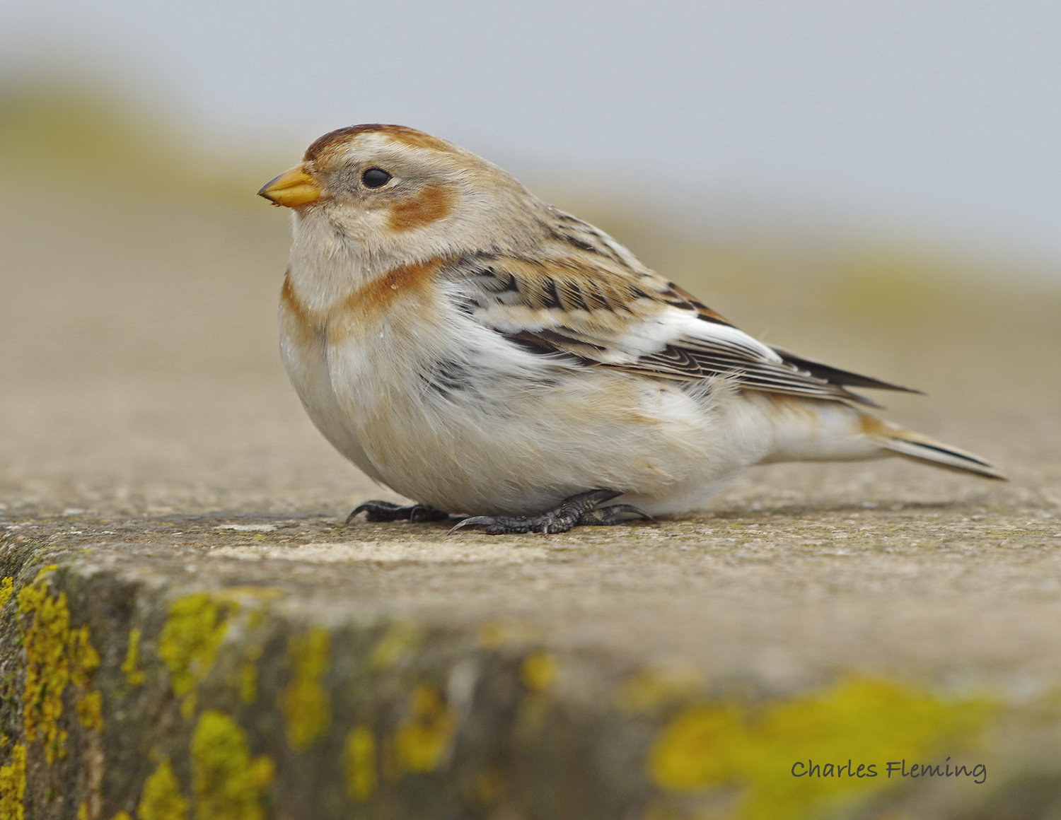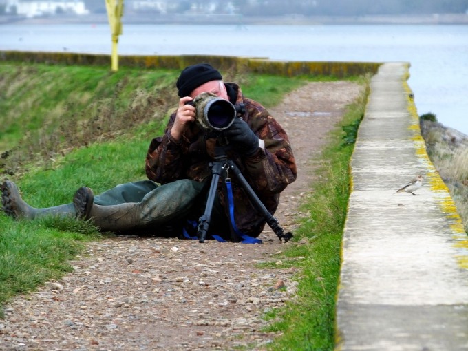 I have to say that I am massively excited and pleased with this photograph that I took today. It was wet, windy and a typical British winters morning when I made my way out to meet my friend Dave Land who had rung me earlier to tell me of a Snow Bunting close to Powderham Church on the Exe Estuary. I felt like an arctic explorer as I battled against the wind and the driving rain, very fitting as I was on my way to see an arctic bird. Dave had just had a disaster, his camera was blown over on the tripod by the strong gusty wind, and the Canon plastic body didn't stand the impact and smashed almost in half. I really felt for him having damaged three cameras myself in total in such a way. There is always the thoughts of "if only" but fate will always win and eventually you will have an accident. Anyway, the bird was a lovely thing and in common with all arctic species, very confiding. I had read somewhere that Shore Lark, if you get very low and lay down, think the you are a four legged animal such as the Reindeer that they are familiar with and this is exactly what reaction I had from the Snow Bunting. It made its way towards me and when everyone had departed, the bird not only wasn't worried that I was nearby but actually seemed to seek me out and came to rest right next to me which was a magical thing.. Obviously this was also a brilliant opportunity and I took many, many really good close ups. Dave Cawthraw is a nice chap that I have met on many occasions and he took my photo as I photographed the bunting…..me in action so to speak and thanks Dave for sending it to me.