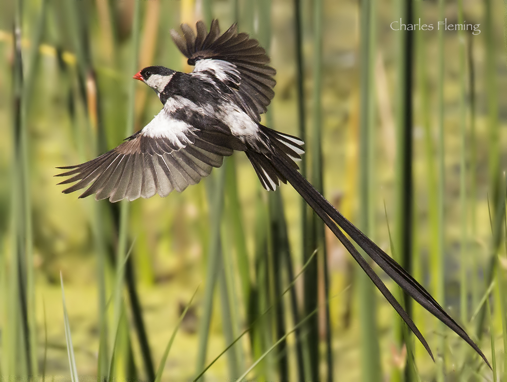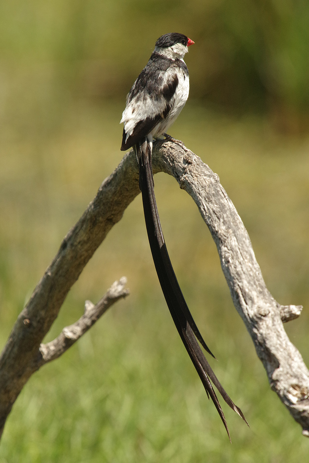 This is a bird that I have always been interested in because when I was much younger they were very commonly kept in captivity and you would see them in just about any bird dealers shop. This was sad really because most would not have been looked after properly and they never bred in captivity. This is a bird that has a very interesting breeding cycle. They are a brood parasite and lay their eggs in the nests of small waxbill finches. The female is totally sexually dimorphic and does not resemble the male in any way except in the non breeding season when he loses all his finery and finishes up looking like the smart, but drab female. The tail is fluttered around like streamers and is almost twice the length of the birds body. It constantly flutters in the wind both when at rest and in flight. When I watched yesterday, this male was very territorial and chased off all other intruders when he spotted them. This included even a Cape Bulbul which is probably 3 times it’s size. As someone who is really interested in birds rather than just as photographic subjects I can’t describe what pleasure it gave me to see this very familiar but wild bird acting naturally rather than the way I got to know the species.