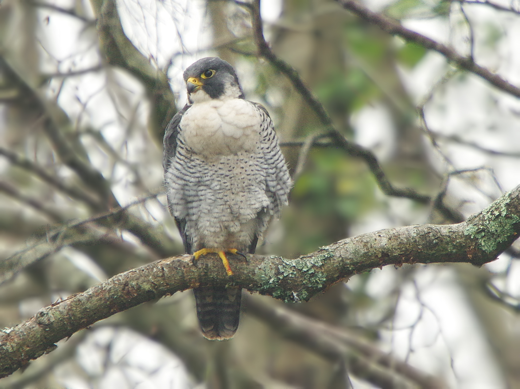 At the Peregrine nest yesterday it was a very quiet session although I did have the male (tercel) in front of me for most of it. I heard him call but in the dank conditions I couldn't see him at first but I knew he was there somewhere. After a few minutes, I located him sitting quietly on the old oak in one of the favourite perches where I have seen both birds on numerous occasions over the last 3 years. Oddly, this is the the first time I have seen them there this year though. It sat there for more than 2 hours just doing nothing, but it seemed quite alert, as though he was keeping watch. I have a another little hide that would have given me great views in front of that tree but I would not have been able to get in to it without disturbance, particularly when he was so alert. My camera is working remarkably well this year so I am quiet content with the shots I took of him. Yesterday I had seen that he thad a blood soaked talon and he has today as well. Also, note the bulging breast, this is an indication that he has recently fed, the bulge is food in the crop. I really love this pretty little Tercel, I have seen him for 4 years running and feel I know him well. He is a lazy bird who does not waste any energy and seems to spend lots of his time just sitting around. In fact, Peregrines do sit resting for hours on end. This will be because of the food they eat. Once fed, they then need to allow it to pass through from the crop and in to the stomach and then of course, this needs to digest. A long process compared with other birds who have a fast digestive transit and need to feed often. The food they eat dictates their behaviour, hence birds of prey, particularly Peregrines do not need to search for food constantly and consequently this dictates their seemingly lazy behaviour. Sitting on one leg like he is in the picture above is a sure sign that he is at rest and relaxed.