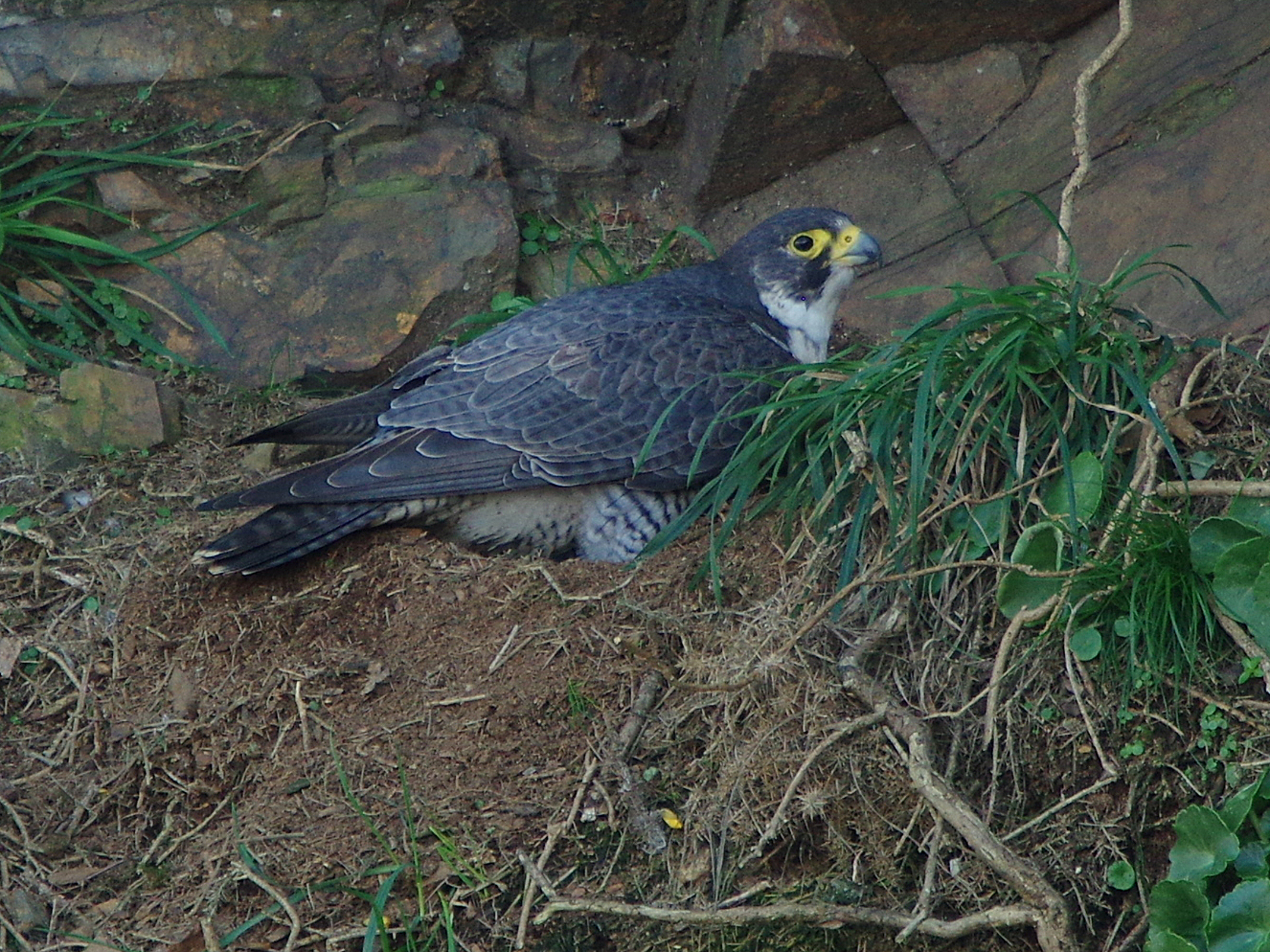 There was silence for almost an hour after I got there this morning but eventually from nearby, there was almost constant calling that went on for 15 minutes or more. I knew that the one bird had been joined by the other, I could hear two now. Almost immediately, I heard the "clucking" call. Then it was also obvious that they had taken to the air because I heard their clucking from various places above and around me. I caught sight of them in arial courtship, a magnificent spectacle and the first time that I had witnessed it. They were soaring and interacting at a great height and speed, unfortunately I quickly lost sight of them because they were moving so quickly. Then a while later, I knew that they were nearby again, I could hear them "clucking" away and interacting. The tiercel was first to visit the ledge at 1308. It had seemed like a long wait in the cold windy conditions but it was really worth it because he is such a marvellous looking bird. Oddly, he perched in exactly the same spot that I have seen him before. He stayed for a few minutes and then flew off strongly. Then at 1322 the falcon arrived. I wasn’t surprised, I was expecting her, but what did surprise me was that she remained in that position for well over 10 minutes, acting very cautiously and remaining motionless. This was a great opportunity to study her carefully. She is slate blue on the back and I could see that every flight and wing feather was perfect. Each wing covert is barred and edged with a subtle lighter grey. On the back there are a few feathers here and there that are not as blue as others instead they are brownish. Eventually she moved in to the hollow and did some digging with her talons. Then after circling around the hollow for a minute or so, she sat quietly in the nest as if incubating. She remained there for at least 30 minutes and was still there on the nest when I left. Is there an egg?