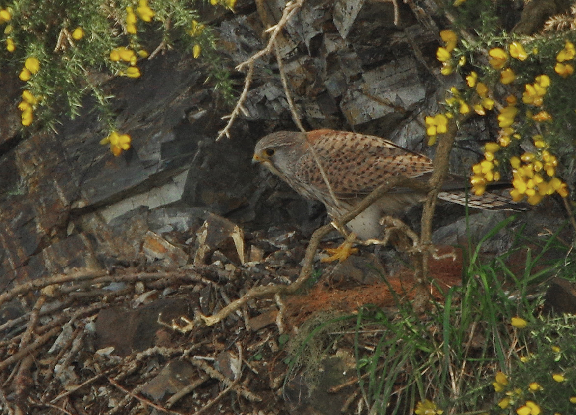 I visited again yesterday and it was probably one of the most interesting of the season so far. It wasn’t all about Peregrines though. When I arrived I was pleased to see the falcon standing on the nest ledge, this is a sure indication that she is going to try again and lay another clutch of eggs. However after just a few minutes she flew out of the quarry and out of sight. Then a bird arrived and without me getting a proper view, landed on an old Raven’s nest to the left, but not far from the normal breeding ledge. I trained my optics there and I was surprised to see, not a Peregrine but a female Kestrel. She was clucking in breeding display and bobbing up and down excitedly, surely a sure sign that she is interested in breeding here. Kestrels are known to not only choose a rock ledge as a nest site but they also like to use disused corvids nest so this would normally constitute a perfect nest site. But so close to the Peregrines nest ledge, surely there is bound to be conflict. After flying from the ledge it perched in the nearby oak tree and remained there for an hour or so, even having the audacity to use the Peregrine’s favourite perch. Later, after well over an hour, I heard the clucking call of a Peregrine and the female flew in. The Kestrel, even though well aware of the much larger bird of prey, hardly reacted. With the Peregrine now on the nest ledge, I had the pleasure of having two magnificent falcon species in front of me. The Peregrine worked on her nest and the Kestrel then flew on to her chosen ledge and began to display and call in a very animated way. This is all very interesting and I look forward with a lot of anticipation to discovering the outcome of this alliance. Will they tolerate each other?