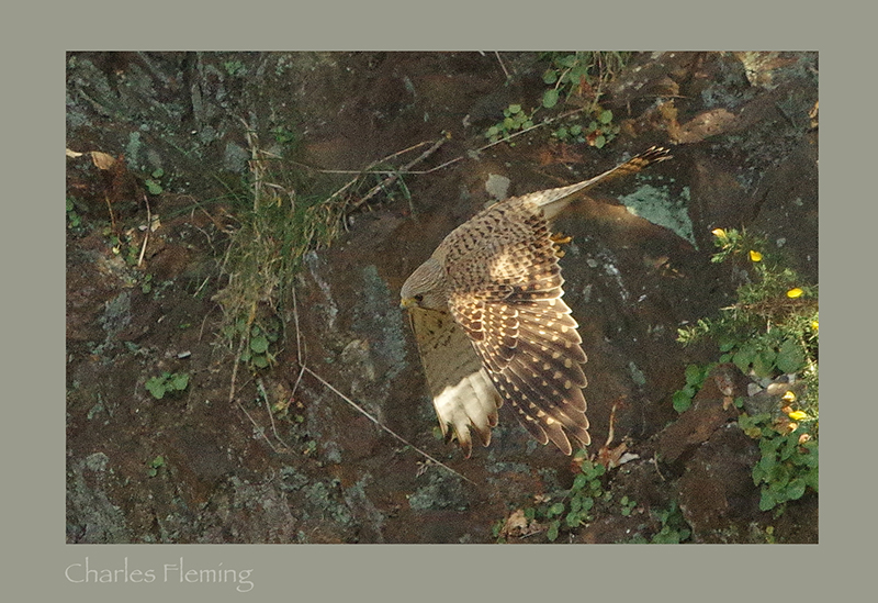At the site where I am licensed to photograph Peregrines I have, this last two weeks or so been joined by a pair of Kestrels. Yesterday their breeding activities were really ramped up with both birds on the their chosen nest ledge – an old discussed Raven's nest. I watched the female shaping a scrape with her body, in much the same way as the peregrines do and then I observed the male displaying to his mate on the ledge. Then both birds were in an adjacent tree and I was hoping that they would copulate. I have been informed that there will be no conflict between the resident Peregrines but this will be an interesting liaison. The male Kestrel is a feisty bird and I have seen him on several occasions mobbing, or flying at the female Peregrine. He may have a death wish! It will be fascinating if both nests are successful, can you imagine if there are juvenile Kestrels and juvenile Peregrines in the territory together? Well, in fact I am informed by raptor experts that this will not be unusual and there are records of Peregrin adults actually feeding juvenile Kestrels in confusion. Instinct is a great thing and I doubt that the Peregrines can resist the begging calls of the closely related falcon species. Unfortunately the distance from my hide to the nest ledge is quite a big one so the photos are the best I can do. This is the female Kestrel flying from the ledge