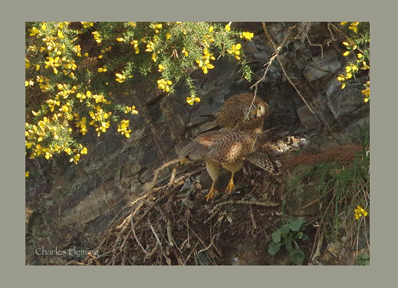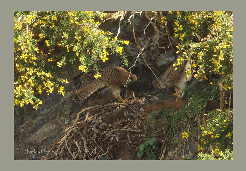 Then we have the male and female on the ledge, male in the front he is a young bird and still has a barred tail.