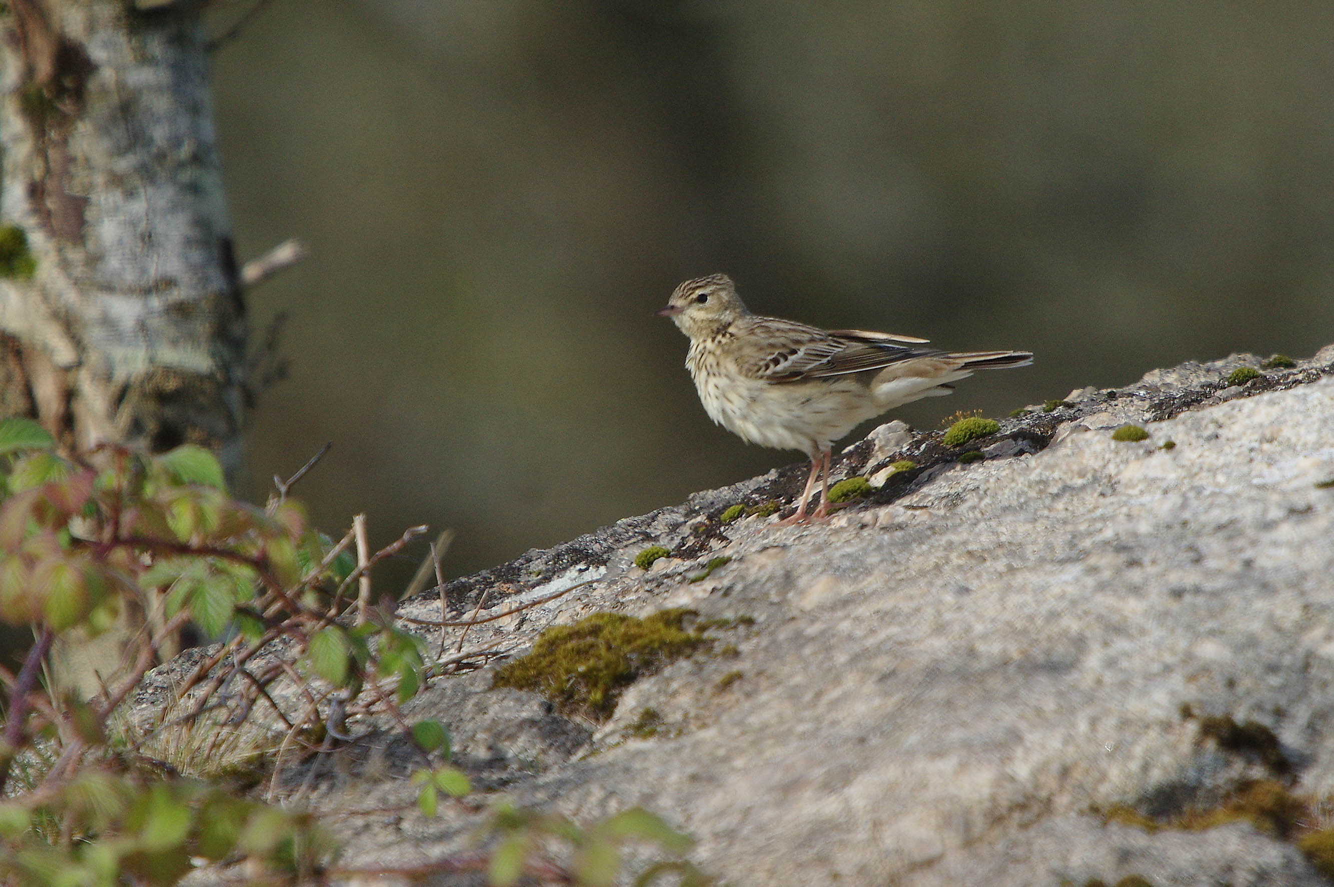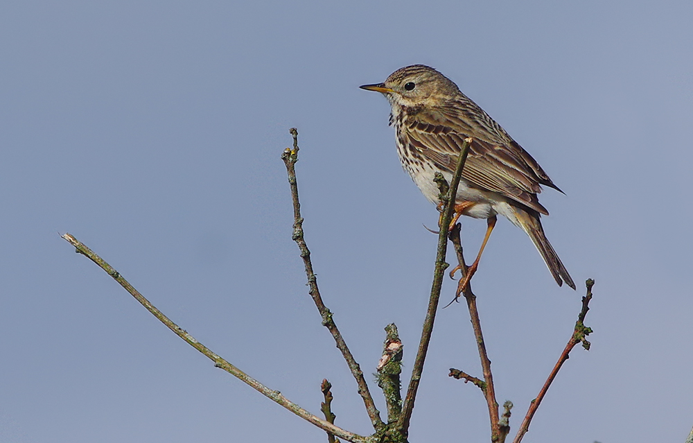 The bird above and below is a Meadow Pipit, note the flanks heavily barred right down to the legs. I have also noticed that the legs of Tree Pipits are more flesh coloured. I was quite sure that the bird below was a Tree pipit but on closer inspection, the claws are far too long and indicate that this is a Meadow Pipit.