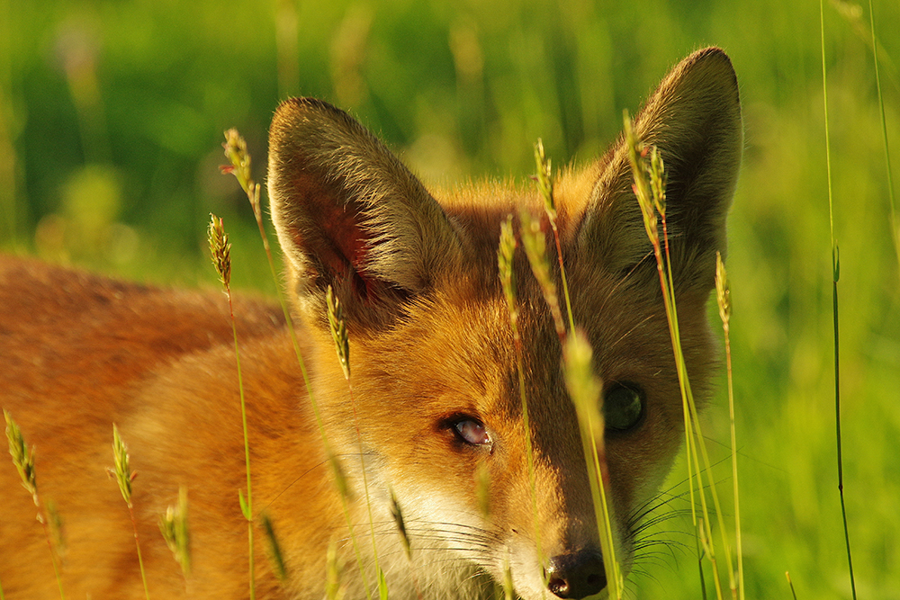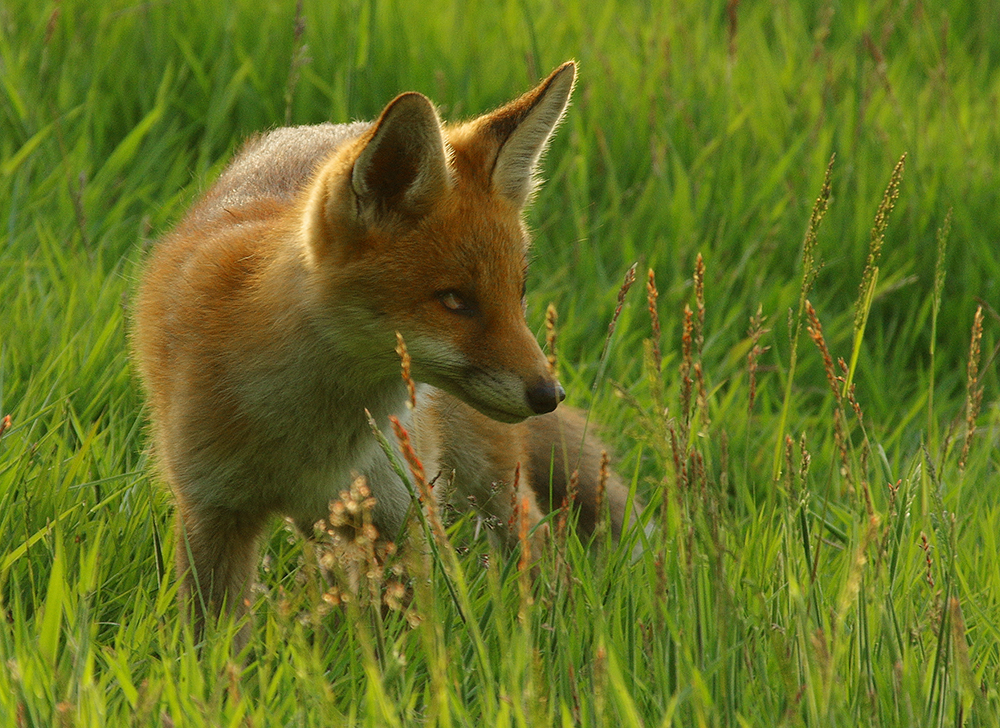 I had an enchanting encounter with a family of young foxes yesterday evening, just before sunset. I had seen a fox by my caravan hide the other day, as I quietly made my way there I could see a fox just sitting there in the sun, whats more, it didn't seem to be all that alert or wary and I walked ever closer to it. Then later on, my friend Dick told me that he had seen a vixen and cubs there recently so I thought I would go back with the camera and see if I could get a photo or two. Again, as I approached the gate I saw three cubs who were playing in the grass and oblivious to me but eventually they disappeared in to the cover of the woodland. It wasn't long before one came out again and continued to romp around in the long grass and amongst the wild flowers. It came ever closer and closer to me but was still 30 feet away from my position as I stood out in the open but very still. The wind was blowing in my direction so it probably couldn't scent me. I pursed my lips and made a few loud squeaks which really got the little fox interested and it started to approach me. I have seen my brother do this and knew it worked but I didn't have an idea that it would be so effective. I squeaked again and again and in the end it was literally no more than 6 feet from me, it just couldn't resist being inquisitive. and I could see why it hadn't seen me. One eye was damaged and instead of a bright sparkle there was a white sunken and bloody socket. The poor animal had lost an eye and this was why it was struggling with the concept of caution. I would suspect that with nature being kindest to the strong and fit, this young animal will soon meet its end sadly. How stupid is a fox that would approach a grown man's squeak? Later on I saw an adult fox and tried the squeak again. This time the wary, intelligent animal hastily made its way in to the undergrowth proving that if you want to live to adulthood and you are a fox you have to learn that its probably not a good idea to walk towards a strange sound.