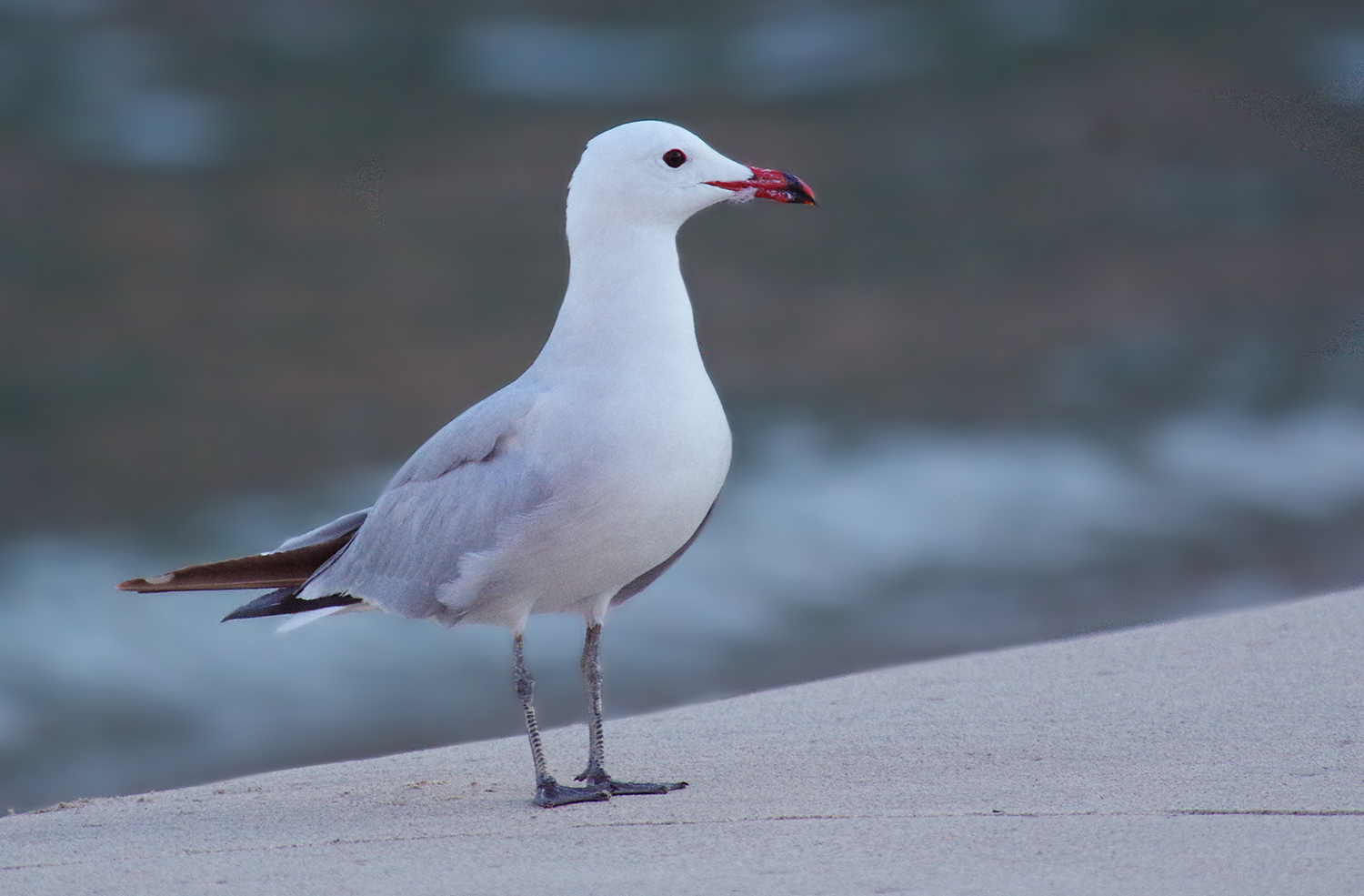 From Wikipedia: The Audouin's gull (Ichthyaetus audouinii) is a large gull restricted to the Mediterranean and the western coast of Saharan Africa. It breeds on small islands colonially or alone, laying 2-3 eggs on a ground nest. As is the case with many gulls, it has traditionally been placed in the genus Larus. In the late 1960s, this was one of the World's rarest gulls, with a population of only 1,000 pairs. It has established new colonies, but remains rare with a population of about 10,000 pairs. This species, unlike many large gulls, rarely scavenges, but is a specialist fish eater, and is therefore strictly coastal and pelagic. This bird will feed at night, often well out to sea, but also slowly patrols close into beaches, occasionally dangling its legs to increase drag. The adult basically resembles a small European herring gull, the most noticeable differences being the short stubby red bill and "string of pearls" white wing primary tips, rather than the large "mirrors" of some other species. The legs are grey-green. It takes four years to reach adult plumage. This species shows little tendency to wander from its breeding areas, but there were single records in the Netherlands and England in May 2003. This bird is named after the French naturalist Jean Victoire Audouin.