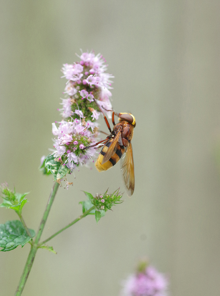 Volucella zonaria is an amazing insect and the reason that I started this blog way back in 2007 when I had one in my garden then and was just in awe then. Yesterday I was attending my vegetable garden when I suddenly caught sight of one nectaring on the flowering garden mint. This is a massive hoverfly, a hornet mimic and is a large, impressive brightly coloured and striped insect, more than twice the size of a common wasp. Of course it is a completely harmless insect but you can imagine that anyone who didn't know better could be quite scared to see it, imagining that it may have a nasty painful sting. I quickly got my camera and took lots of photos and one or two show what a stunning creature this hoverfly species is.