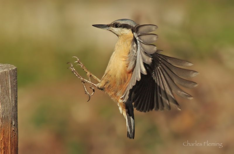 Today's forecast talked about sunlight and I knew that would give me another good opportunity to try to photograph Nuthatches in flight. My results are getting better and better and I now know what I need to do to achieve success. Bright light is an absolute necessity but positioning of the camera in relation to the birds flight path is quite relevant as well. It is very important to try and predict the trajectory which a bird is going to take when it flies down to feed. If you do that then you have a better chance of the bird passing through the point of focus. Next time we have a bright day I will have another chance to practice. I have a plan to use para-cord attached to a tree and down to the feeding stump, This will give me an exact line that a bird will fly on.. It will be just a case of focusing on the cord which will be the flight path of the bird. Then I will set the focus anywhere along the cord. Then with the cord removed I will know where the bird is predicted to be along the flight path. I think this will work but only time will tell. Whether all of this is a bit of overkill, I will only know once I have tried it out but it certainly won't do any harm. But what is certain is that little woodland birds fly at really fast speeds and I am going to do some experiments to see exactly how fast that is. With a stop watch I will record the time it takes to fly a set distance and then just do a basic time, distance and speed calculation. At the moment it's just Nuthatches and Coal Tits that are using the feeder regularly. Oddly, Siskins as yet haven't visited the feeder while I have been there which is odd because I have heard and seen them in the trees all around and over at the feeders by the HQ siskin are pretty much constant visitors and that is only just 300 yards away.
