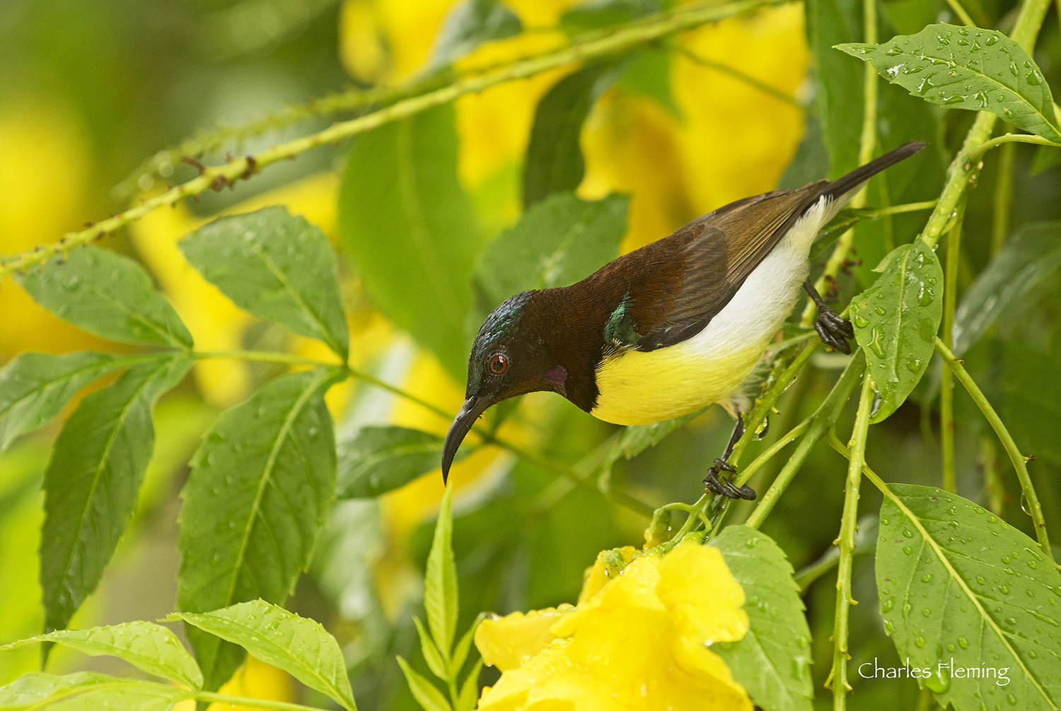I had plans for today but that all went out of the window when the rain that had been falling all night long was still bucketing down when I climbed out of my pit at the rather late time of 8.35. I sat on the balcony of the dream house a short while later, at first with coffee and then with breakfast and at 14.08, as I started to write this I had been there for more than 5 hours and had enjoyed one of the best days bird photography that I can remember. The birds have just kept coming. The star attraction has been a pair, or possibly 3 Purple rumped sunbirds that I hadn’t realised until now, are constant visitors to a yellow flowering shrub which is just feet from the veranda where I am sat. They are feeding by piercing the blossom low down near the stalk to obtain the nectar which they extract with a long and I presume, sticky tongue. There is a name for this feeding behaviour, it does not benefit the plant in any way.