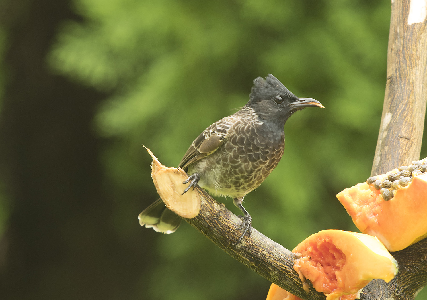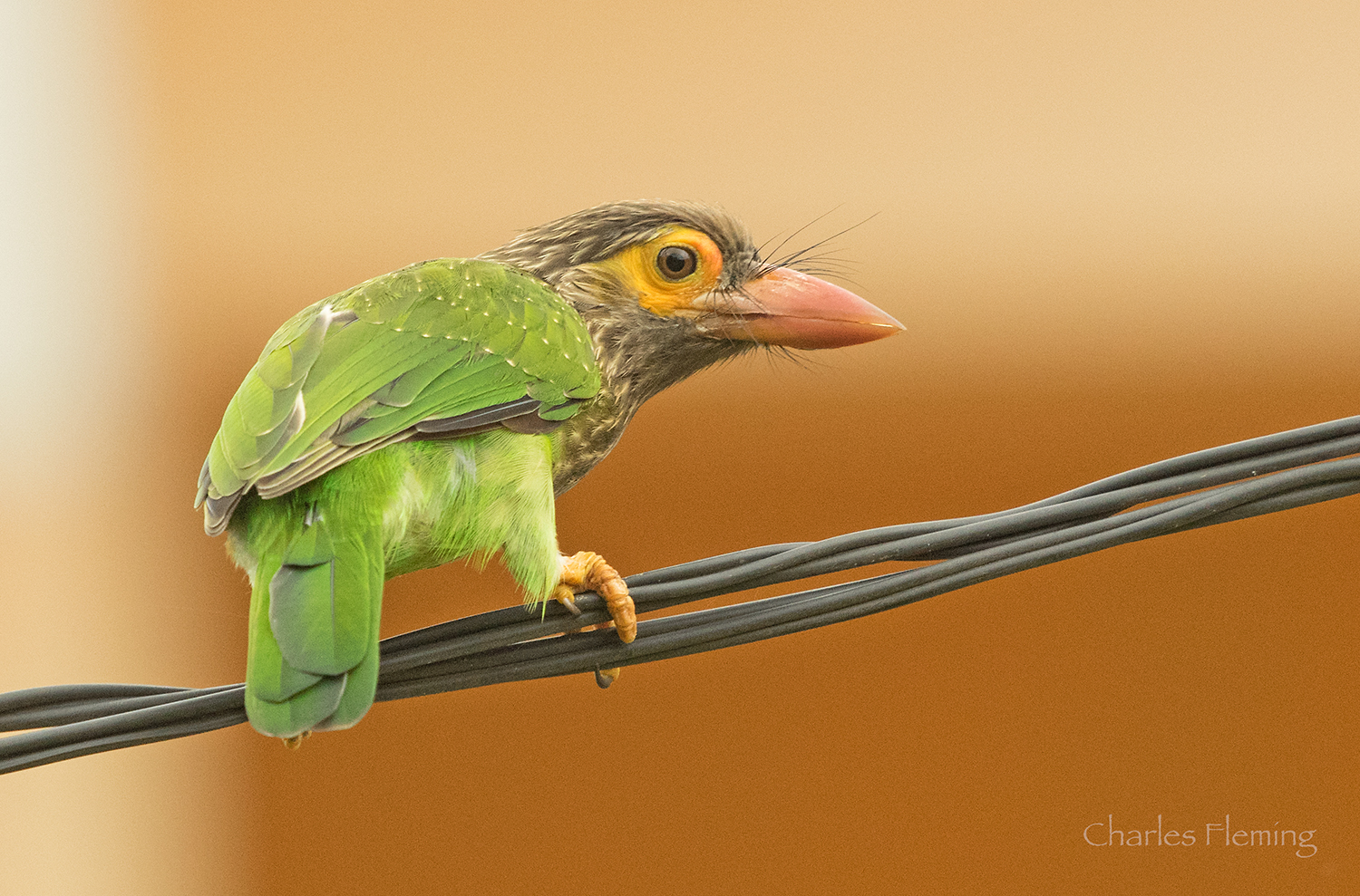 I said the star turns were the sunbirds but a real celebrity flew in, in the form of a Brown headed Barbet, a phenomenal bird. I had only been thinking before I left home that I hoped I would get the chance to improve my pictures of this species and today I took some photographs that I will never ever be able to beat. We have put a stick in the lawn and loaded it with fruit, at first banana and then papaya and the local pair of Red vented Bulbuls are obsessed with the freebies, thats if they can fight off the Myna birds. I thought that the Barbet had come down for the papaya but I was wrong because it had come to feed on the fruit of a plant called …… Ravi has already told me that this plant is a medicinal fruit, a herbal remedy helpful for sufferers of diabetes apparently? That may or not be true but the barbet certainly thought that it was worth taking a risk to get at it. Barbets are the most parrot like birds that you can imagine, but not in the least bit related and with a totally different bill shape. They feed on soft fruit and insects and don’t normally leave the higher branches of trees. They have a very evocative call.