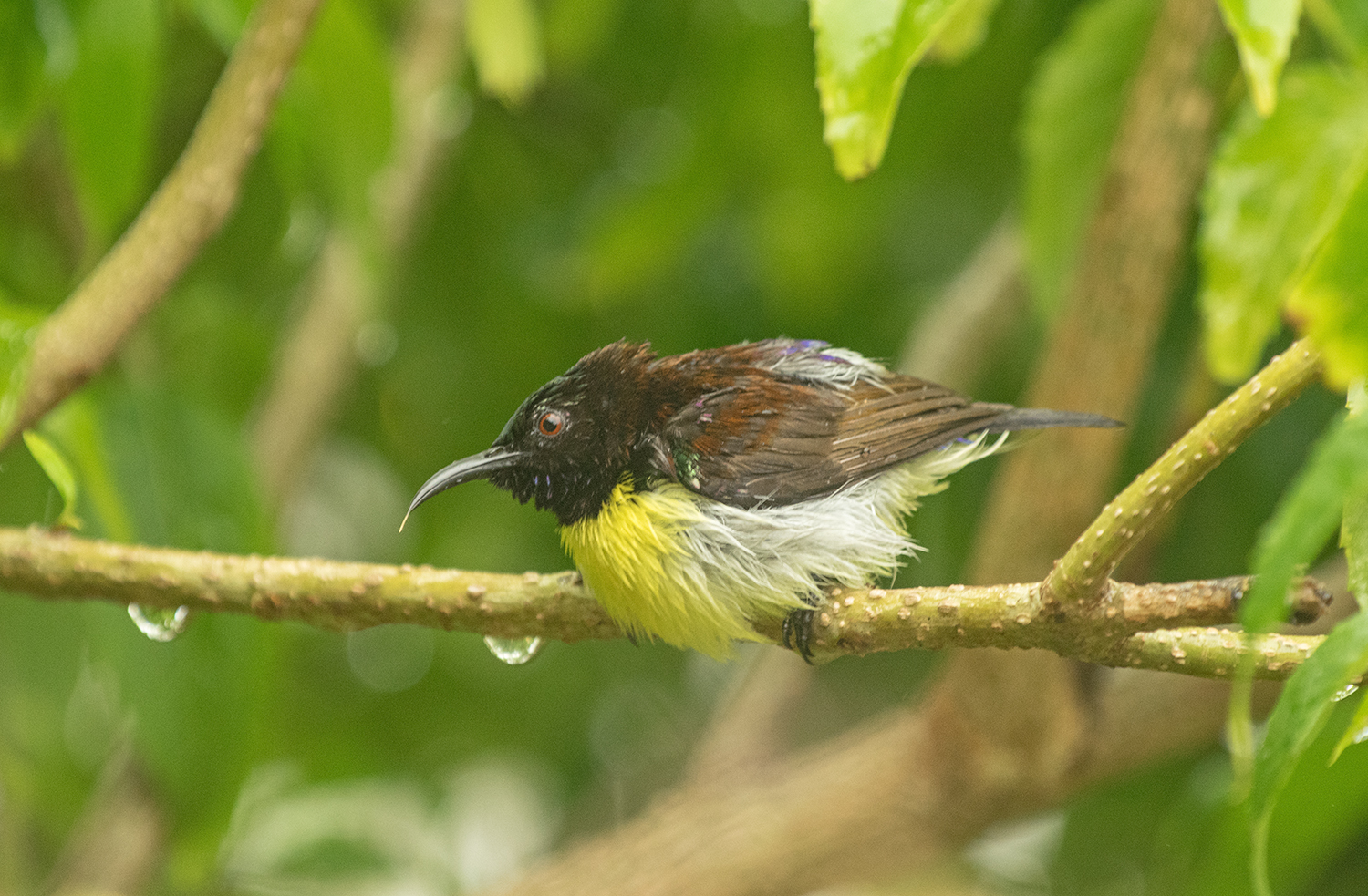 A male Purple pumped Sunbird feeding in the rain this morning.