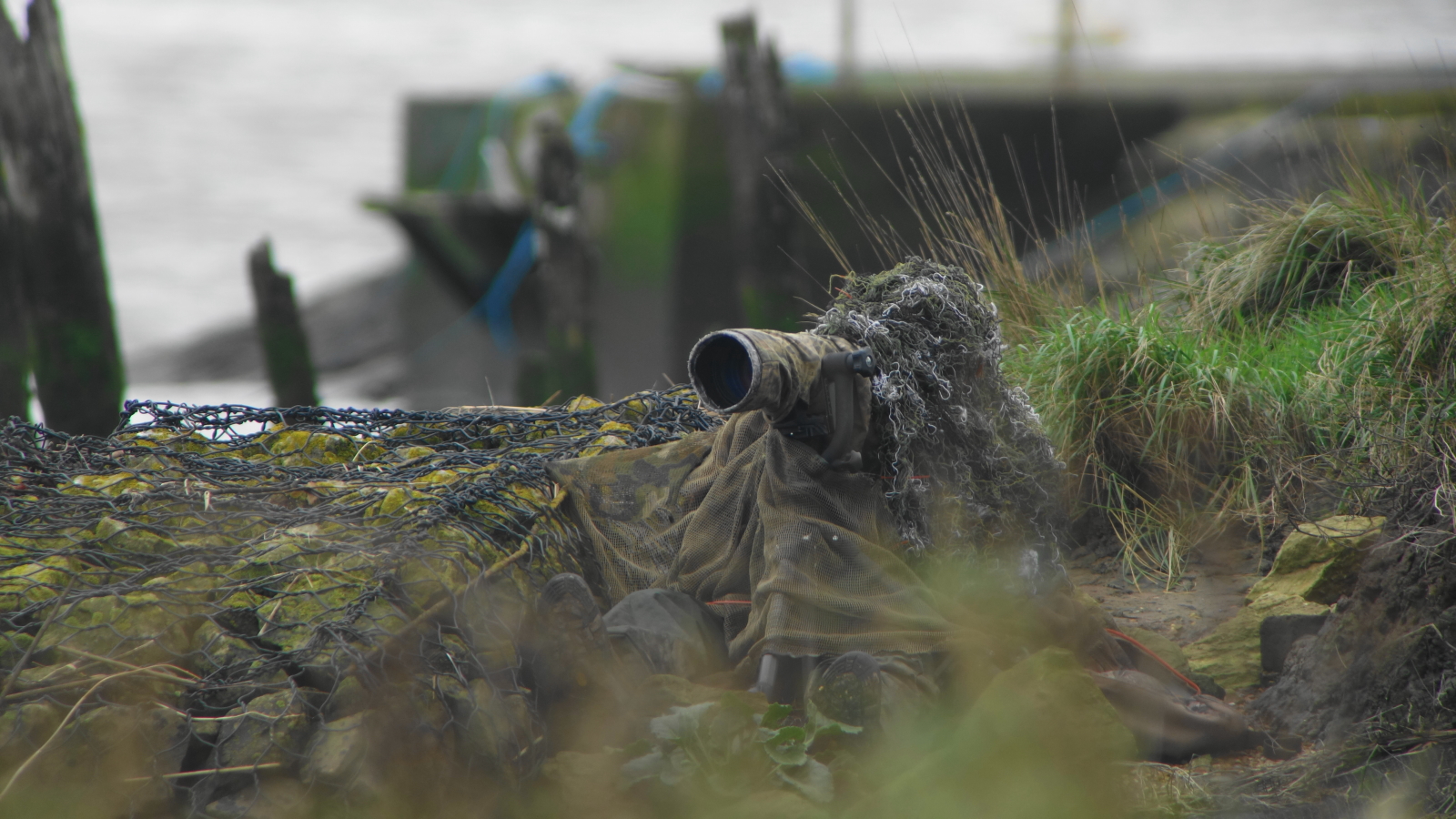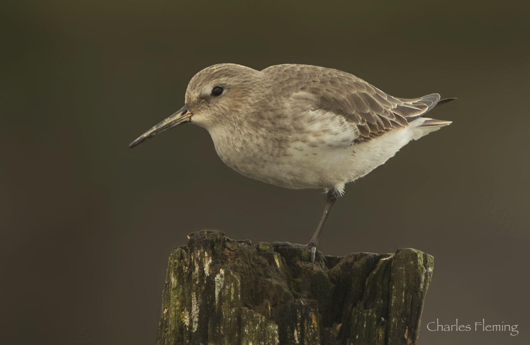 This is a Dunlin. I photographed it this morning in a "stake out" on the River Exe at Turf. When I first arrived the tide was almost at its height and there were a few birds on the posts as I hoped. Unfortunately they departed as I approached and I quickly got myself sat down and under cover. Another birder – Dave Boult – arrived later and took this photo so you can see that it looks reasonably effective. As it happened it worked well and after just a few minutes the Dunlin – pictured above – flew in, perched close by and was totally fooled by the camo. Then after a while a Grey Plover arrived, and landed on one of the posts much closer to me just to my right. I swung the camera very, very slowly in the bird's direction and took some photographs but because of the very overcast conditions with bright reflections from the water the pictures are not as good as I would have hoped for.