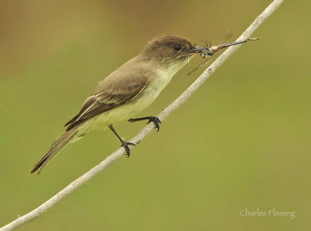 This is an Eastern Phoebe a small flycatcher.  I was trying very hard to photograph this one in flight but the weather just wasn't bright enough for success but suddenly it flew from its perch to fly high to catch this damselfly which it didn't have any problem swallowing whole.